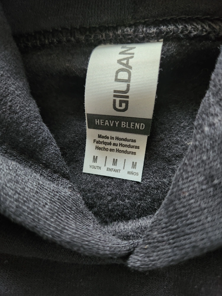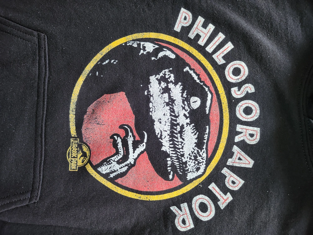 Youth sized medium black Gildan hoodie featuring a Philosoraptor design from Jurassic Park. New and ready for a home!