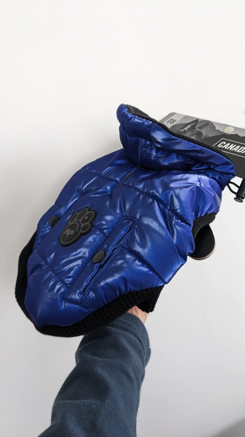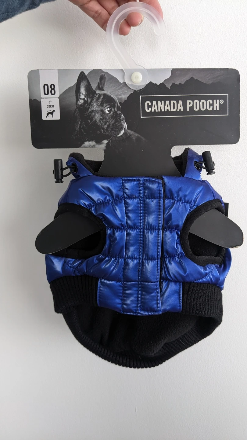 Canada Pooch Shiny Puffer jacket for dog or puppy in size 08 (small). It's a high quality vibrant blue jacket with leash opening and front velcro. Keeps your dog warm and stylish! Brand new unused in original packaging. Retails for $50.