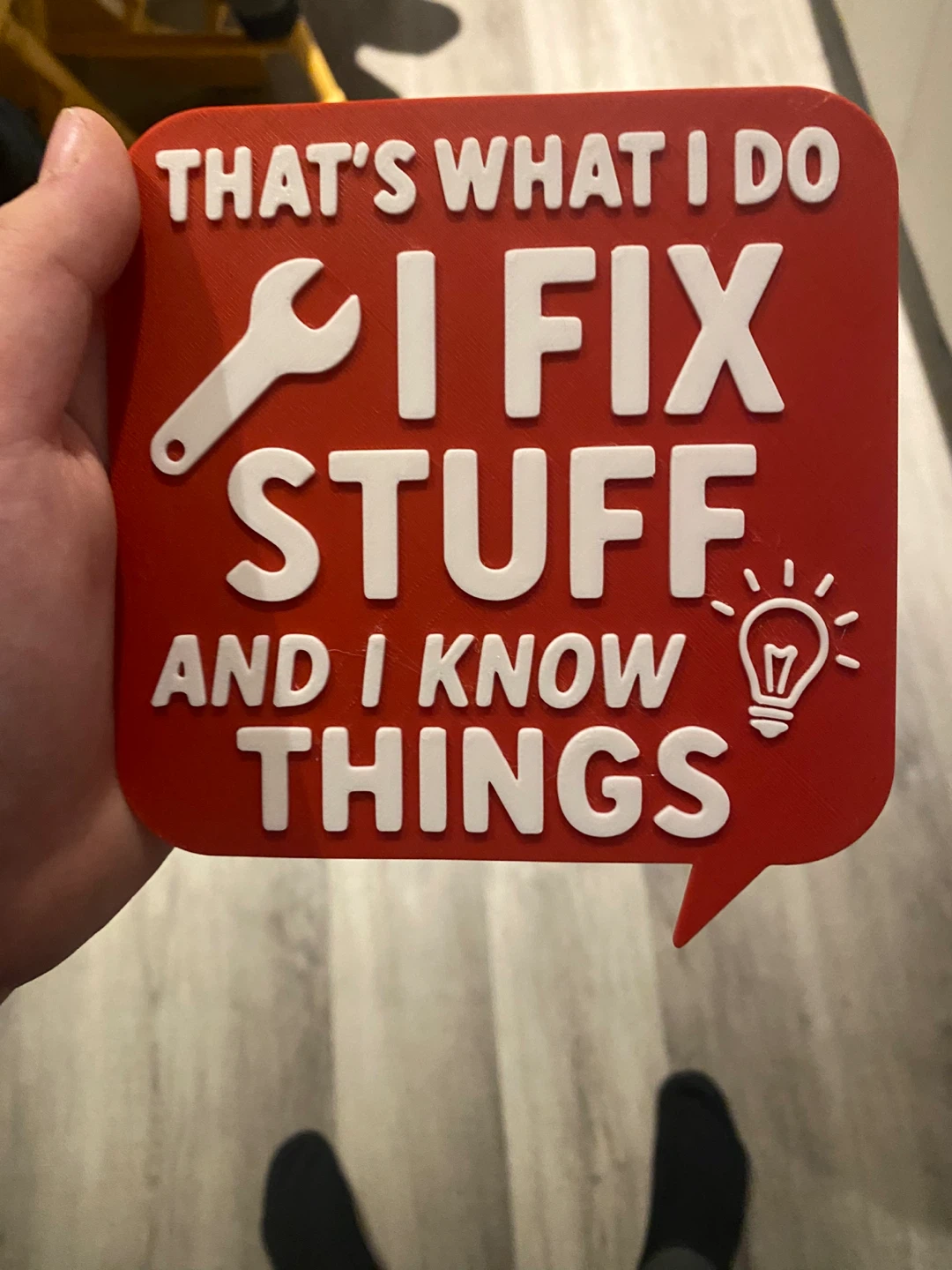 A red, speech bubble-shaped plaque that reads 'That's what I do. I fix stuff. And I know things!' It's made of a sturdy material. Great for anyone who enjoys DIY or has a good sense of humour!