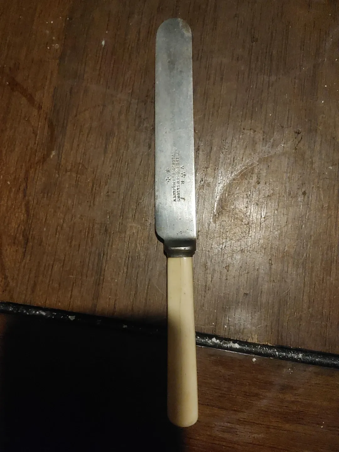This is a vintage butter knife made by Joseph Rodgers & Sons. It features a metal blade and a cream-coloured handle. This knife is well-suited for spreading butter or jam.