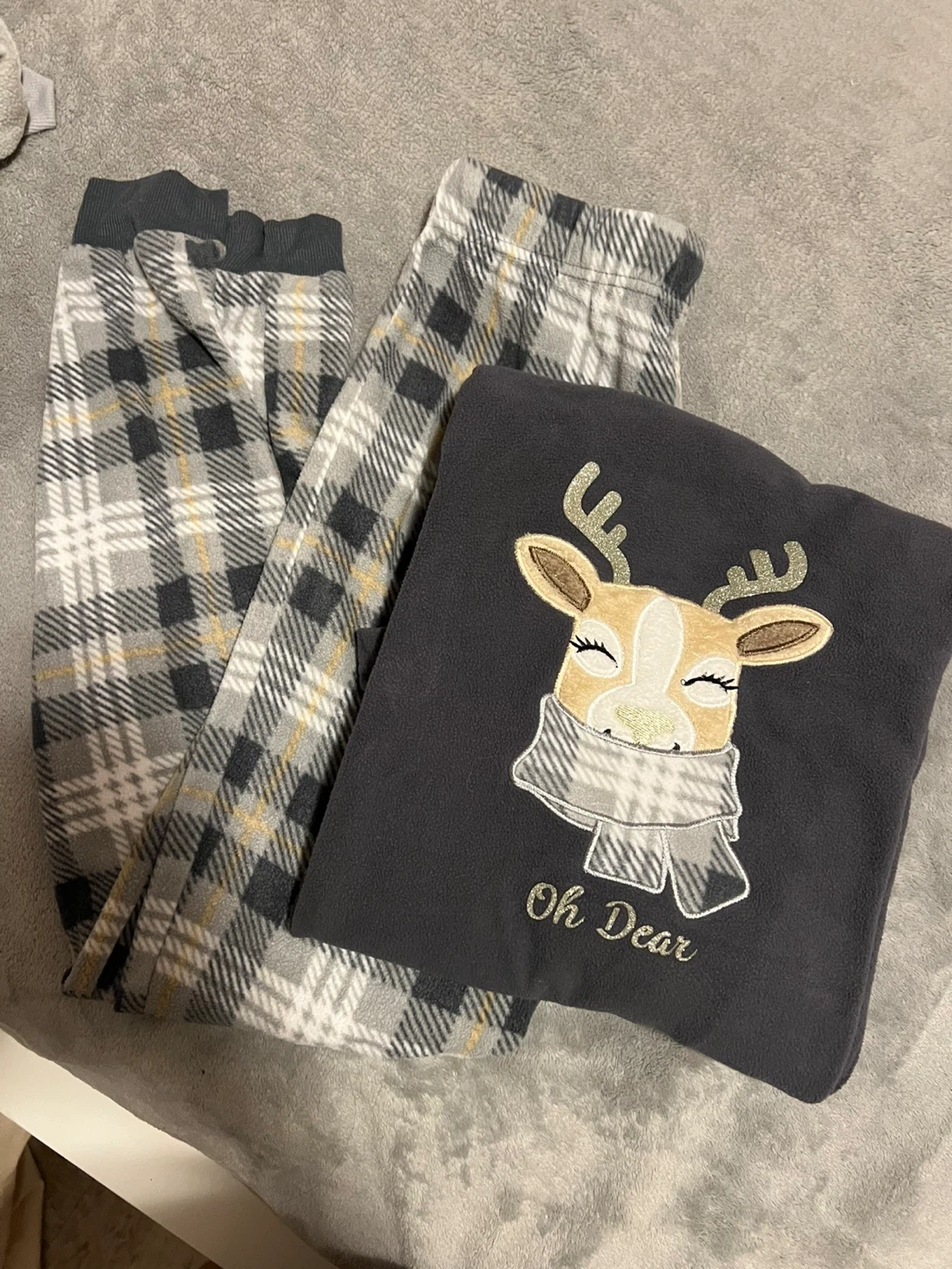 Cozy George brand pajama set, size XS/TP! The set includes a fleece top with a cute reindeer design and plaid fleece pants. Perfect for those chilly nights!