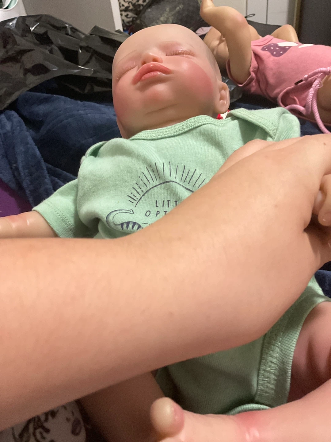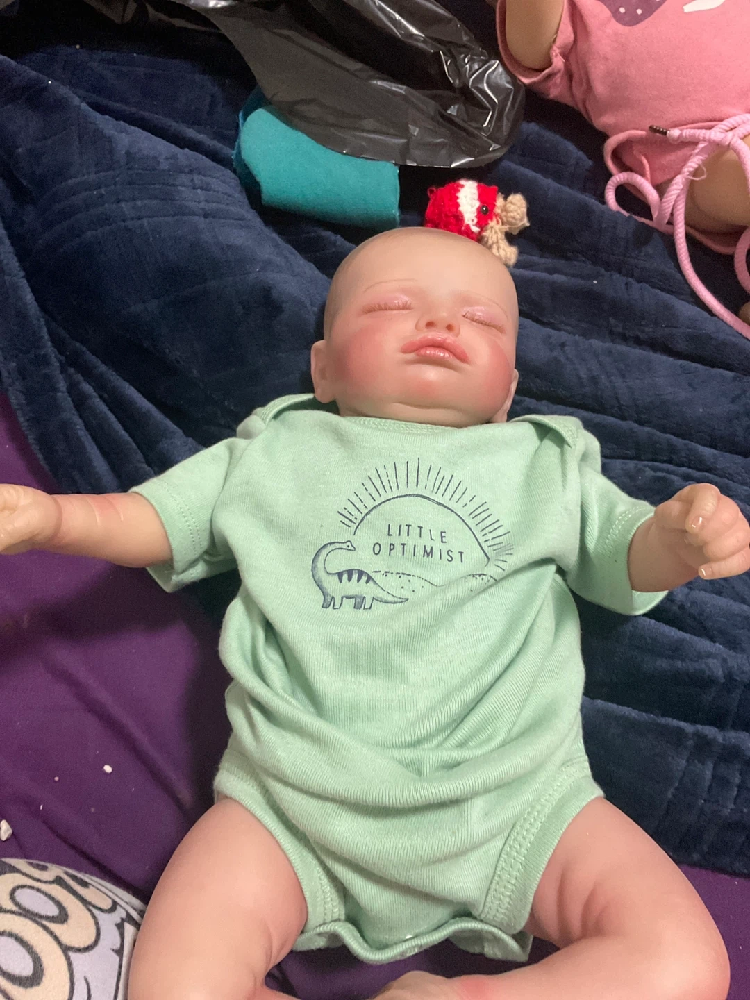 This is a realistic baby doll wearing a cute green onesie. The onesie says "Little Optimist" with a dinosaur graphic. It's soft and cuddly. Perfect for imaginative play!