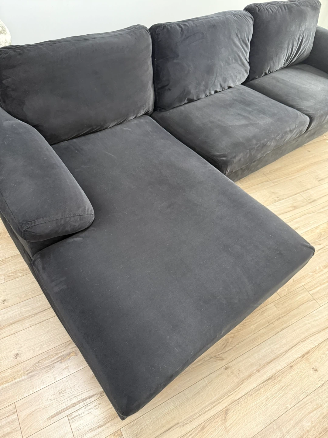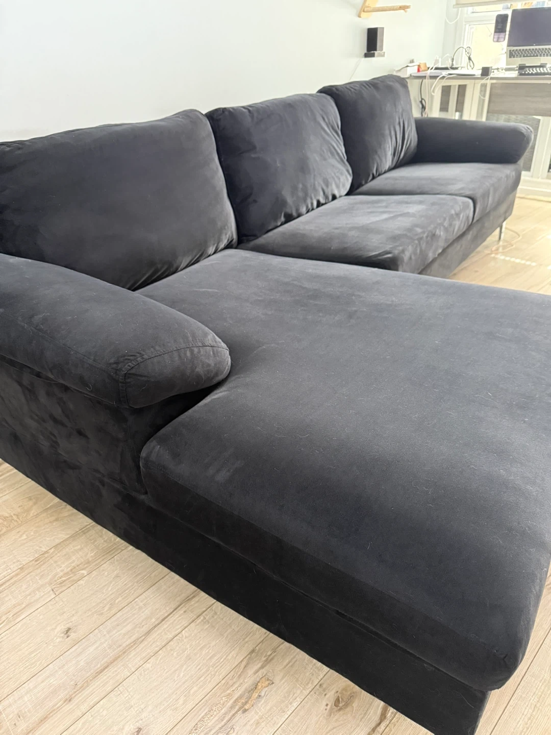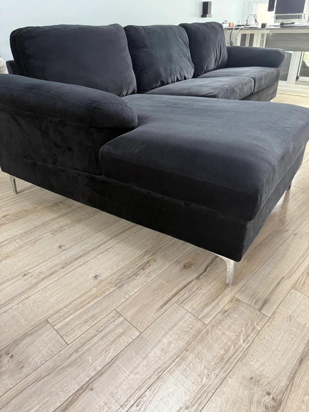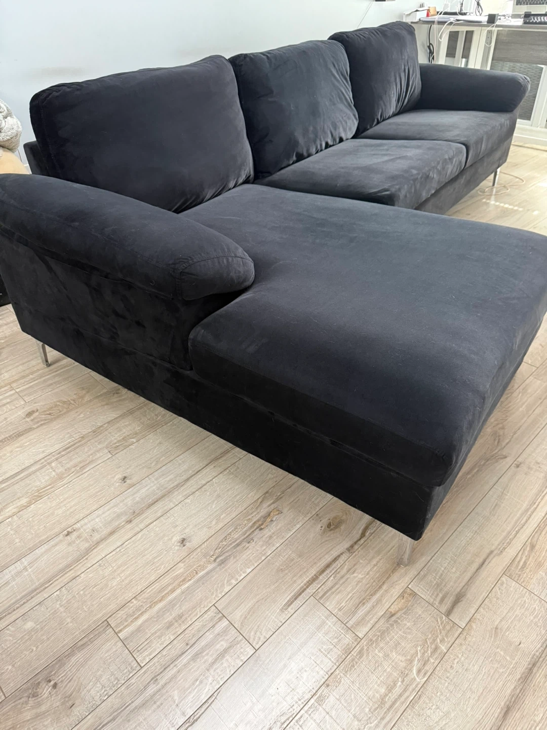 Comfortable dark black sectional sofa. It has a plush velvet-like fabric and sturdy metal legs. Plenty of seating space for family or guests!