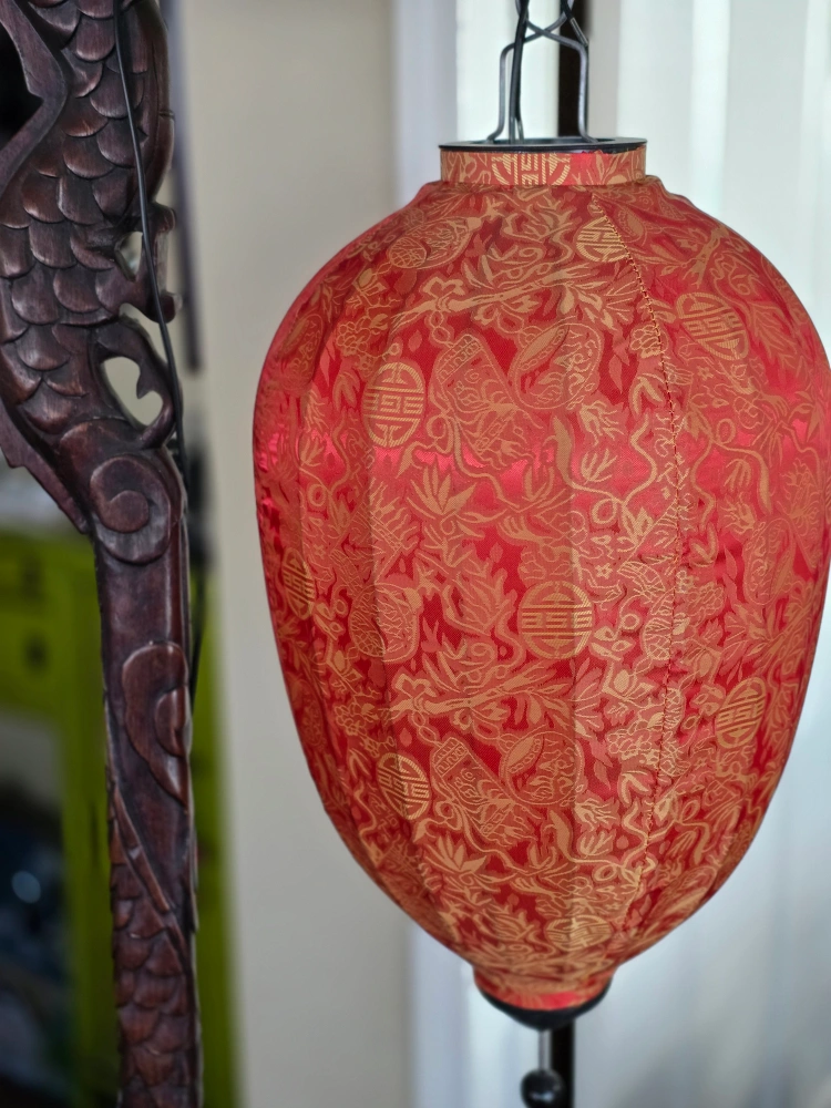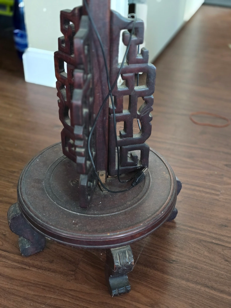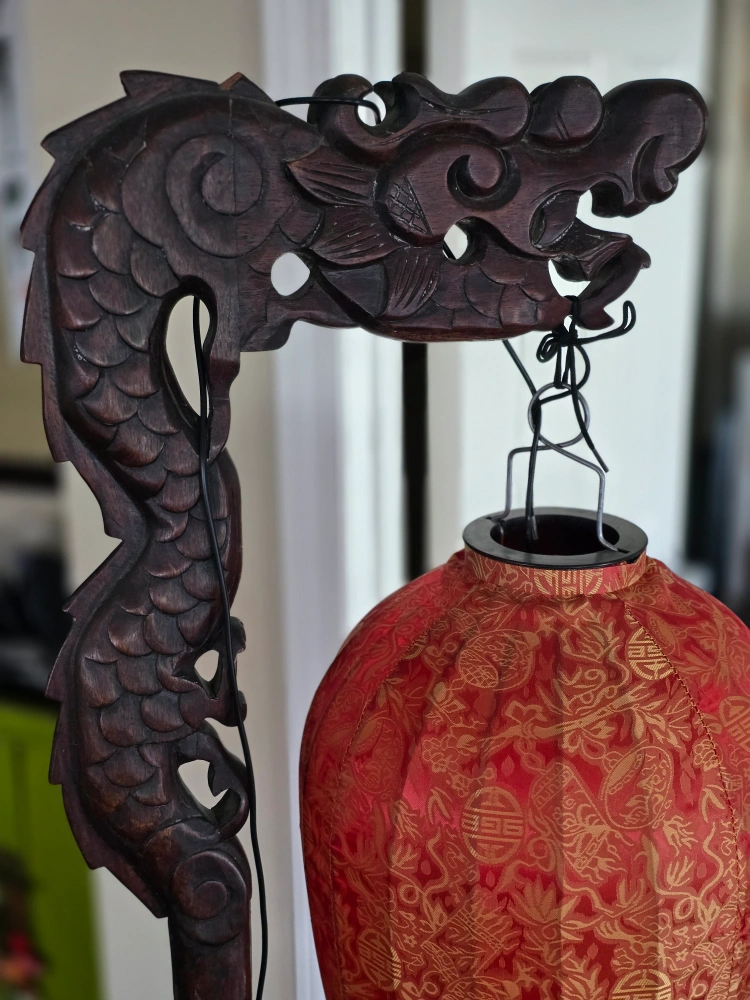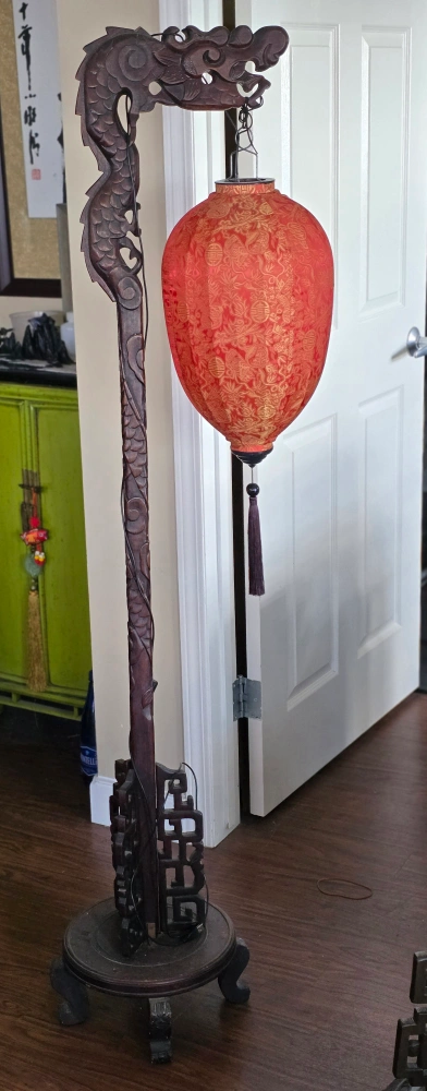 Wooden floor lamp featuring a dragon design. It has a red fabric lantern with a tassel hanging from the bottom. The lantern is designed with gold characters and symbols. the lamp holder is over 100 years old. we currently have a led bulb in the lantern and can be lit up when the usb is plugged in.