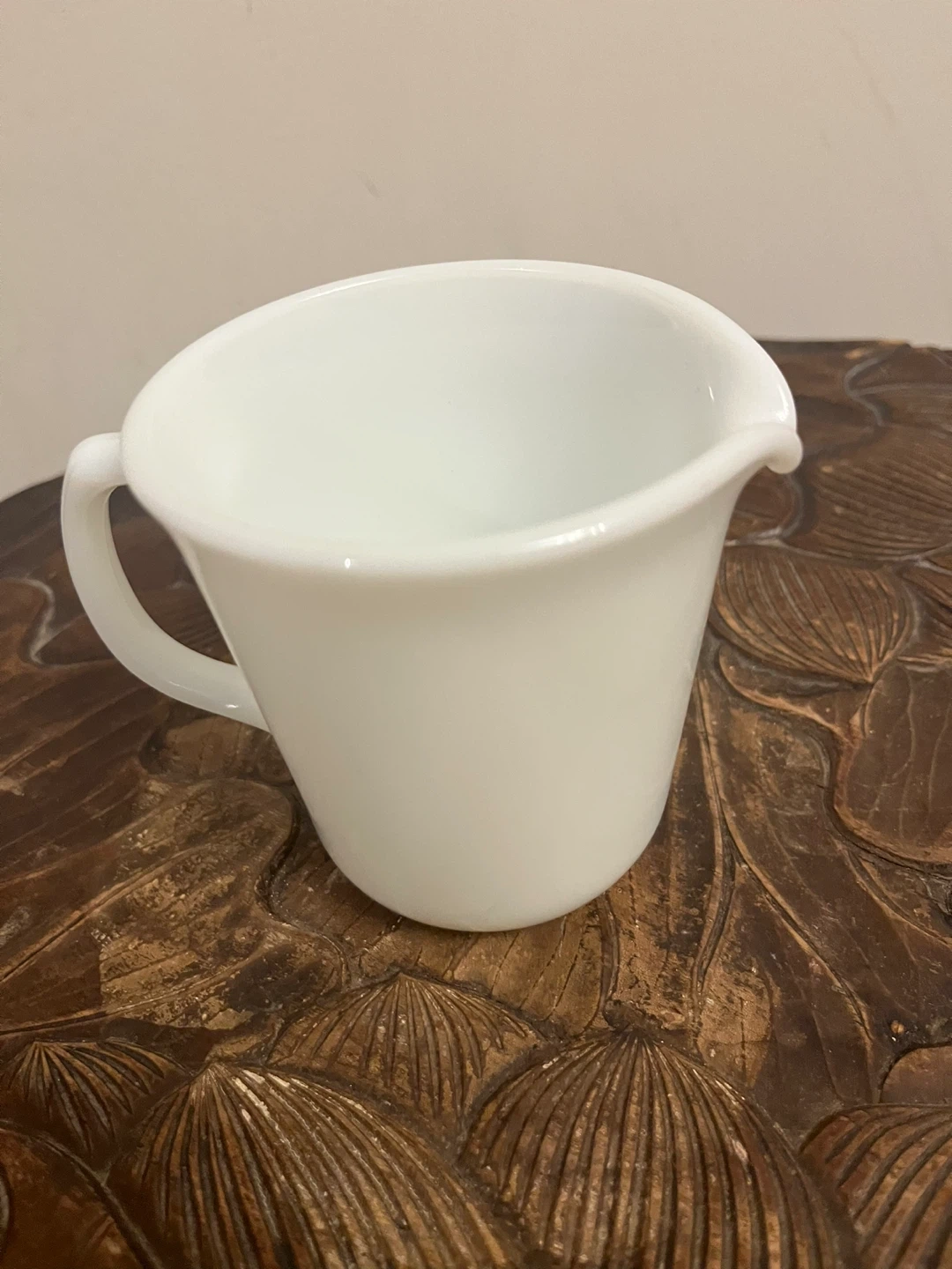 A simple white milk glass creamer pitcher. It's made of durable glass. This creamer's spout is perfect for pouring. Microwave safe. Made from USA.