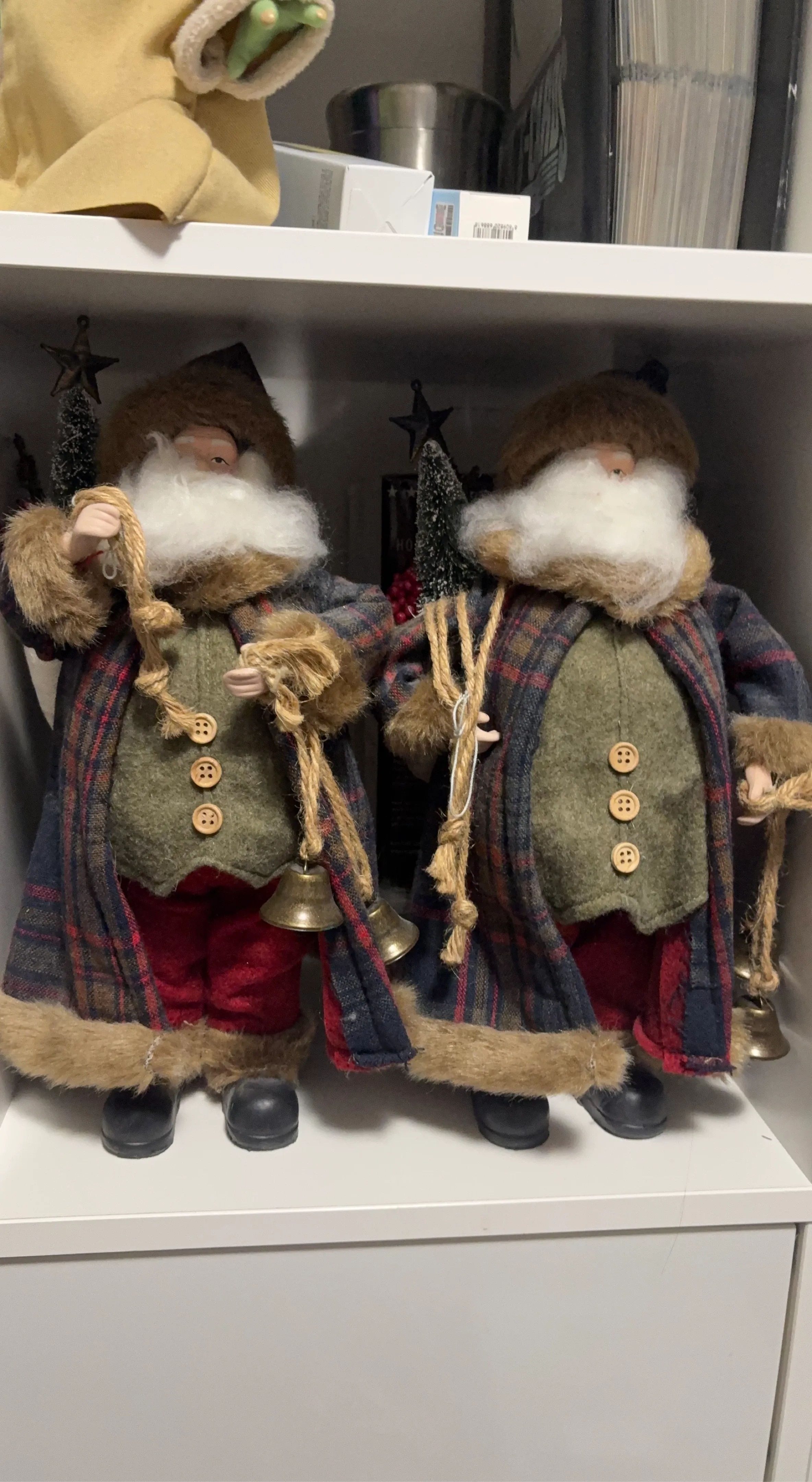 Two festive Santa Claus figurines, each holding a rope with bells. They're dressed in plaid coats, green vests, and red pants, complete with faux fur trim. These would add a charming touch to your holiday decor!