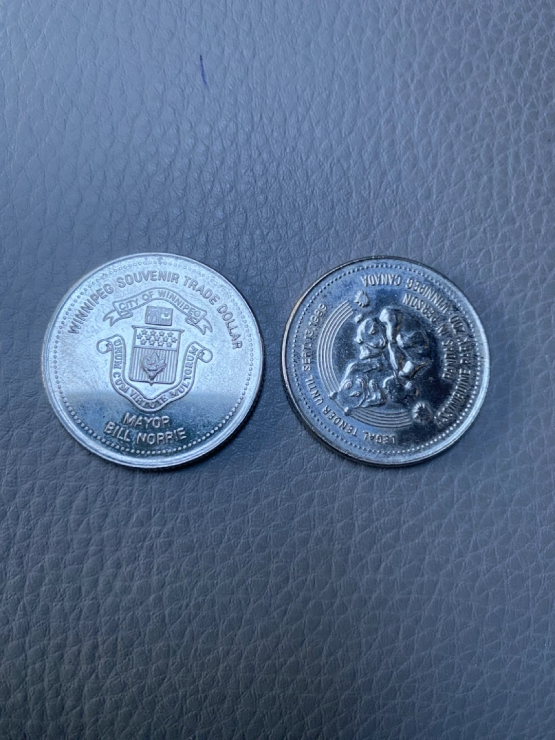 Winnipeg souvenir trade dollar. One side features the City of Winnipeg coat of arms and the name of the mayor, Bill Norrie. The other side has an image of pandas frolicking at the Winnipeg Zoo. Legal tender until Sept 1988