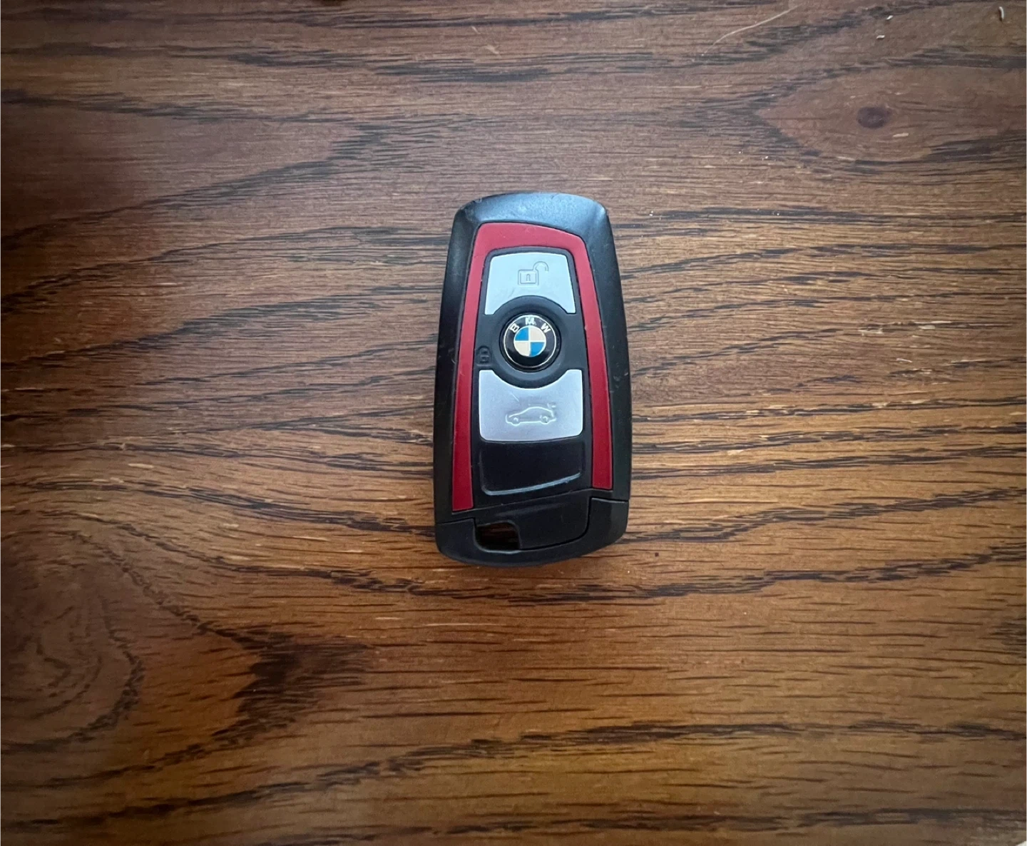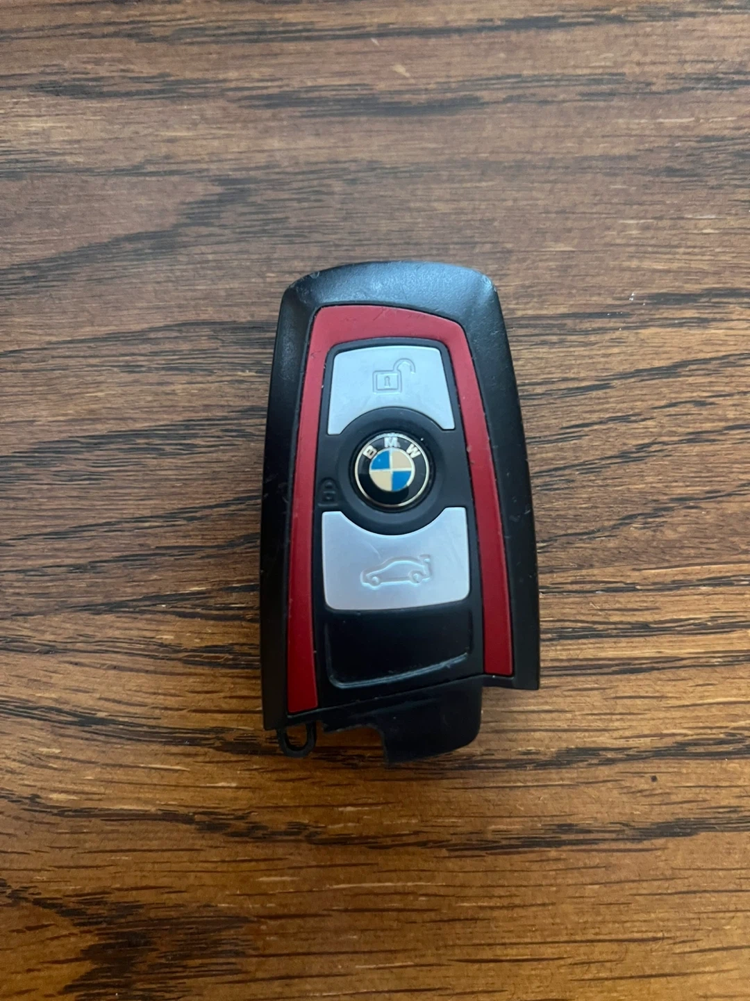 Selling a used BMW car key fob. It's black with red and silver accents. The key ring is also included. Price is Firm if you pick up I’ll do $75