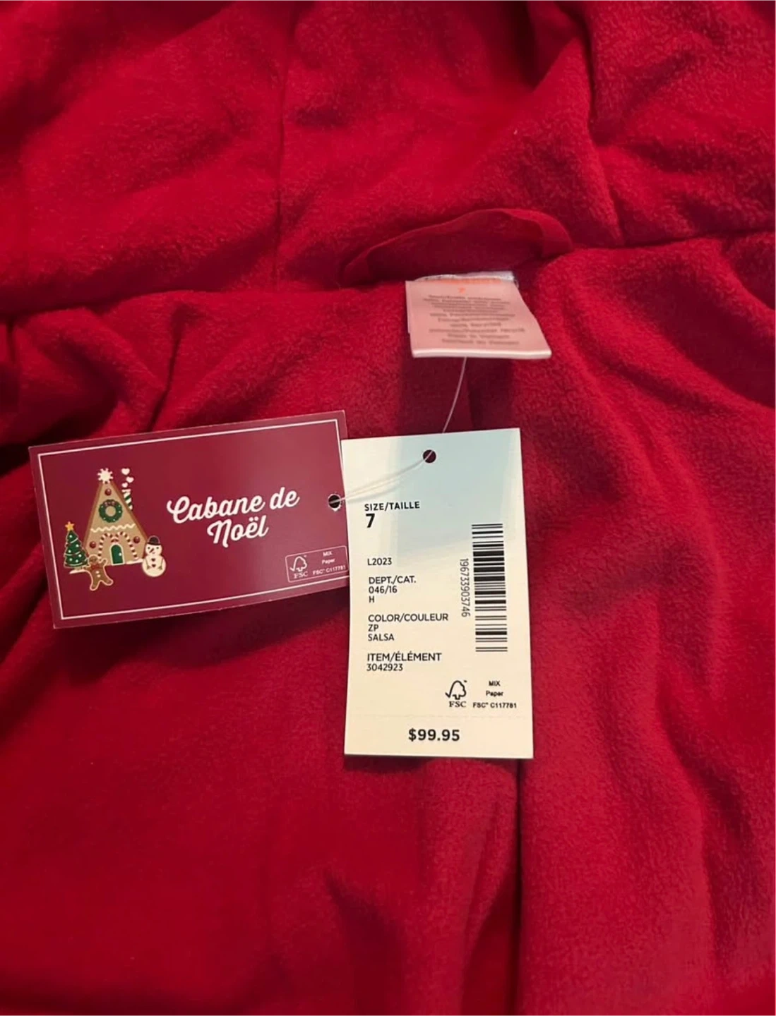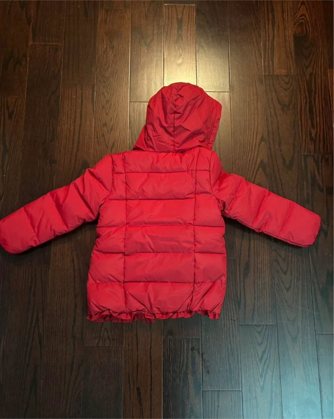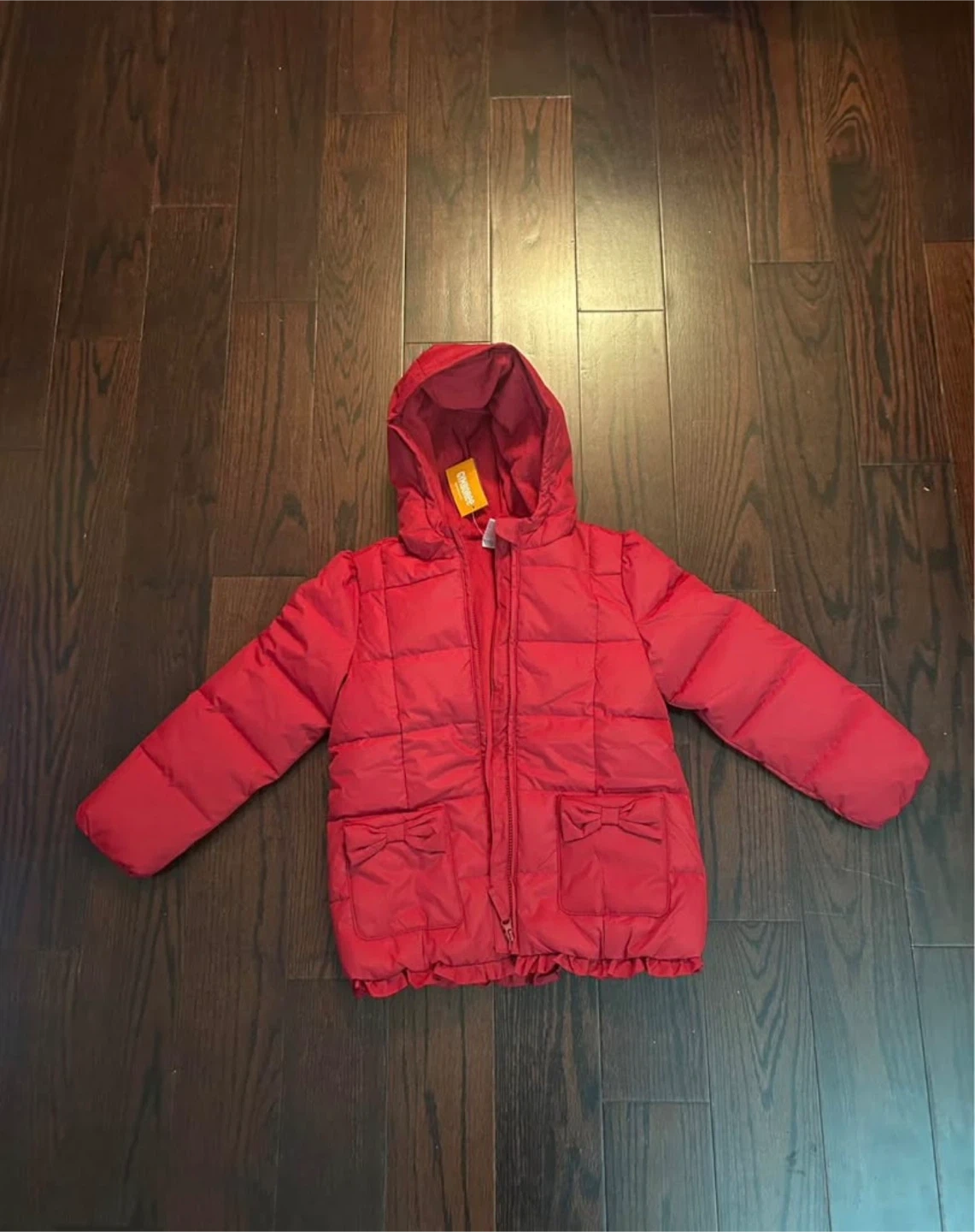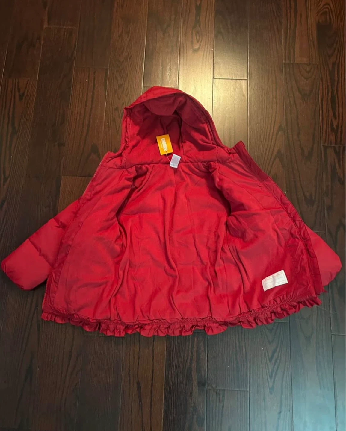 This is a children's red puffer jacket, brand new with tag. It's a size 7 (please check last picture for size reference)