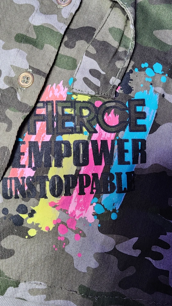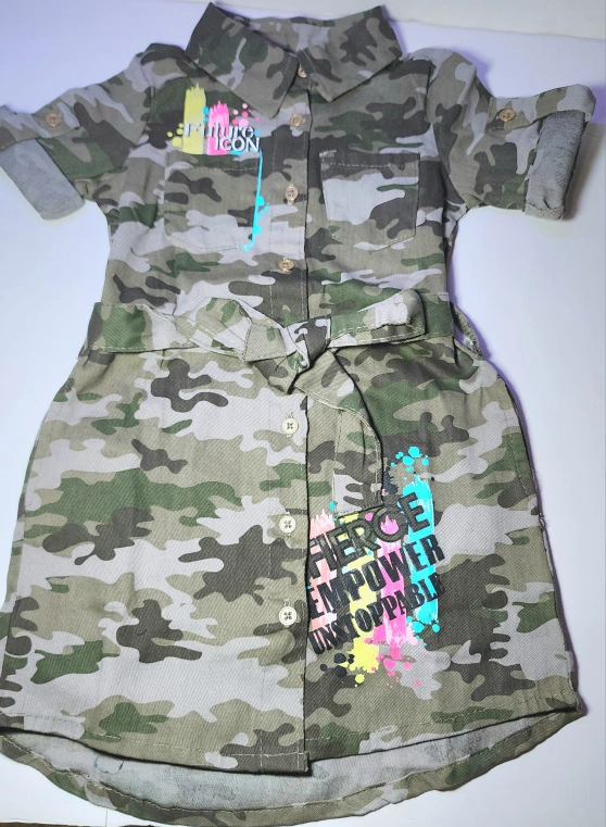 This is a cute camouflage print dress for girls. It features short cuffed sleeves that can be rolled up and buttoned, a button-down front, and comes with a belt. The dress has a fun, colorful design with the words "FUTURE ICON" and "FIERCE EMPOWER UNSTOPPABLE" printed on the front.