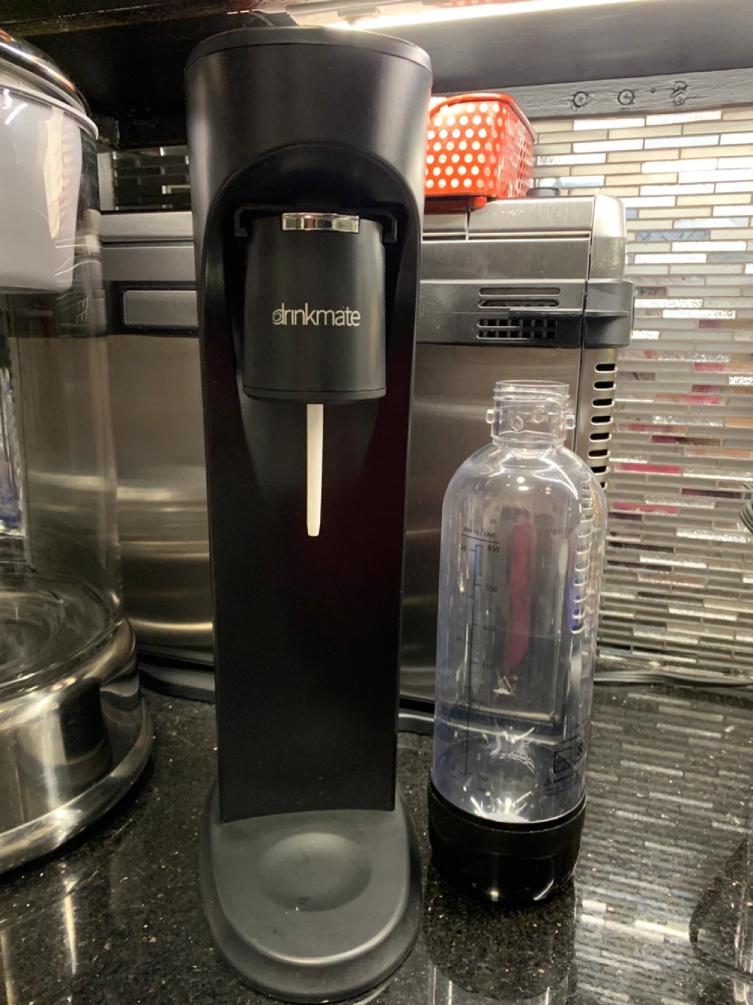 Make your own sparkling water at home with this Drinkmate maker. It's black and comes with a reusable bottle. The bottle has measurement lines up to 850ml.