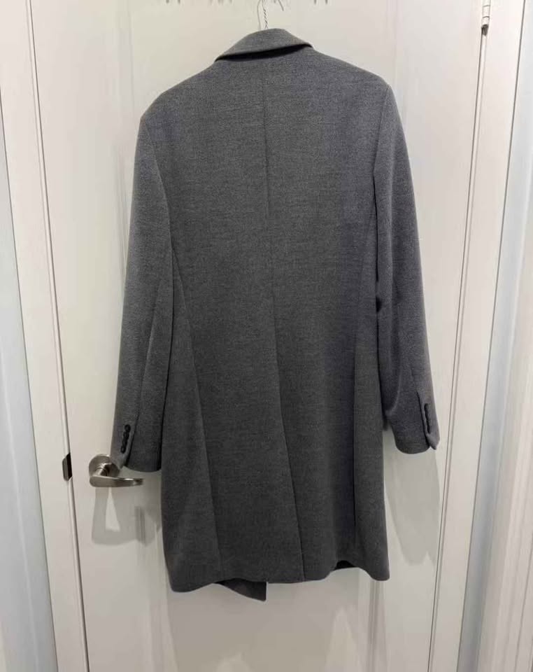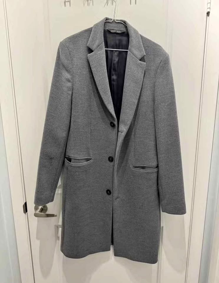 Stylish Zara Man grey overcoat. Has two front buttons and two pockets. Black inner lining. Great for layering. Pick up near Yonge /St Clair.