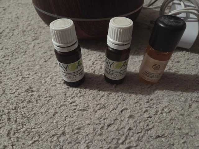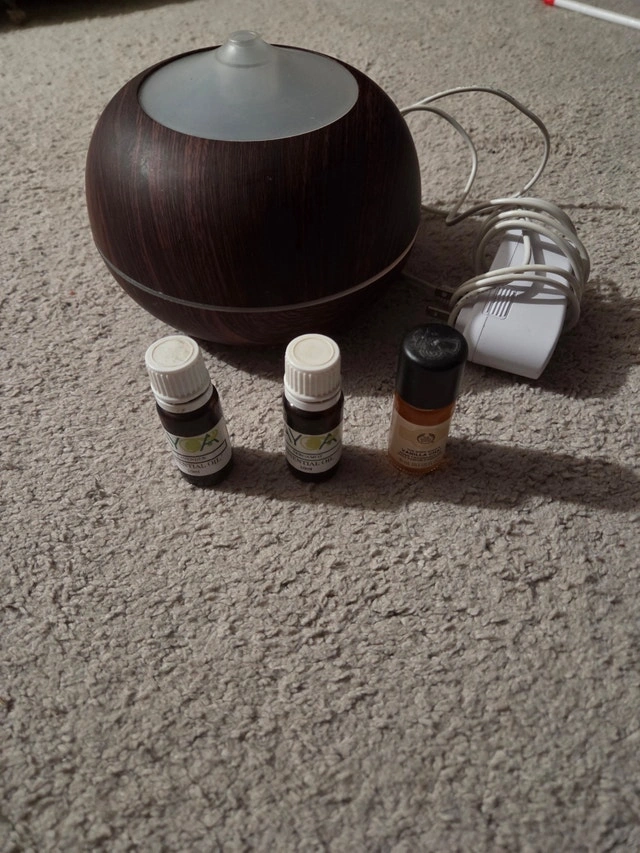 Complete aromatherapy starter set including a large capacity Tenswall 500ml Ultrasonic Diffuser and three high-quality fragrance/essential oils. The diffuser features a classic dark wood grain finish, multiple mist timer settings (1H/3H/6H/ON), and a color-changing LED light. Perfect for large rooms, offices, or bedrooms. Includes 3 Oils (10ml each): AYOA Lavender: 100% Pure Essential Oil (used once). AYOA Bergamot: 100% Pure Essential Oil (used once). The Body Shop Vanilla Chai: Warm, seasonal home fragrance oil (rare/discontinued). Condition: Excellent. All items were used only once or twice and are in like-new condition. Power adapter included.