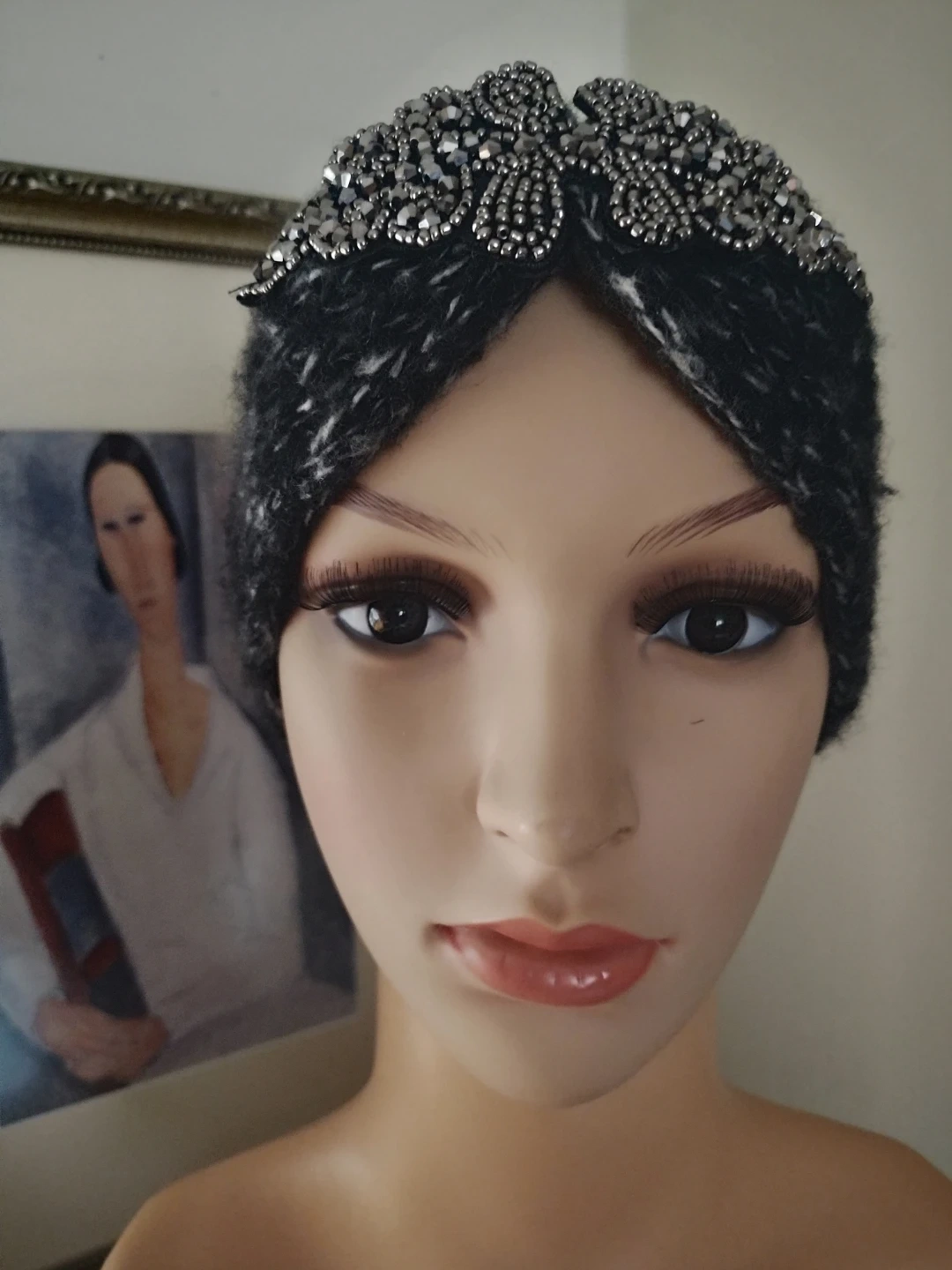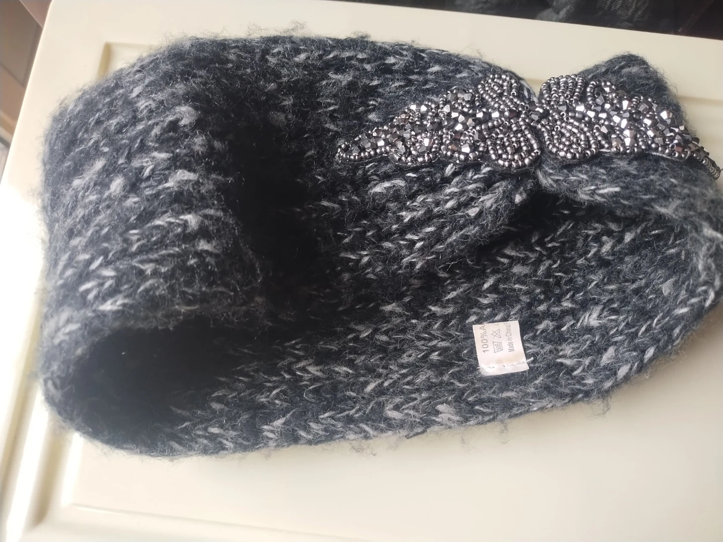 A cozy knitted acrylic headband with stretch, measures 20" x 4". It features a decorative embellishment of beads and crystals. Excellent, clean condition.
