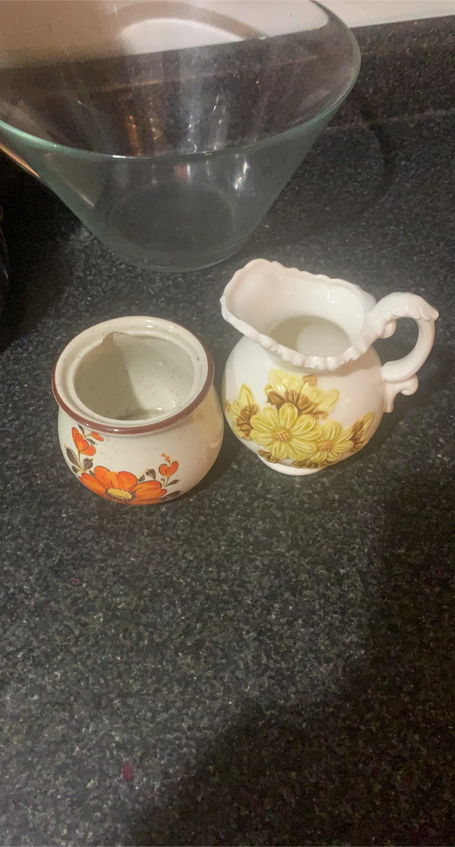 This is a ceramic creamer pitcher and sugar bowl set. Both pieces feature a speckled cream base with hand-painted floral designs. The creamer has yellow flowers and the sugar bowl has orange flowers. Perfect for serving at tea time!