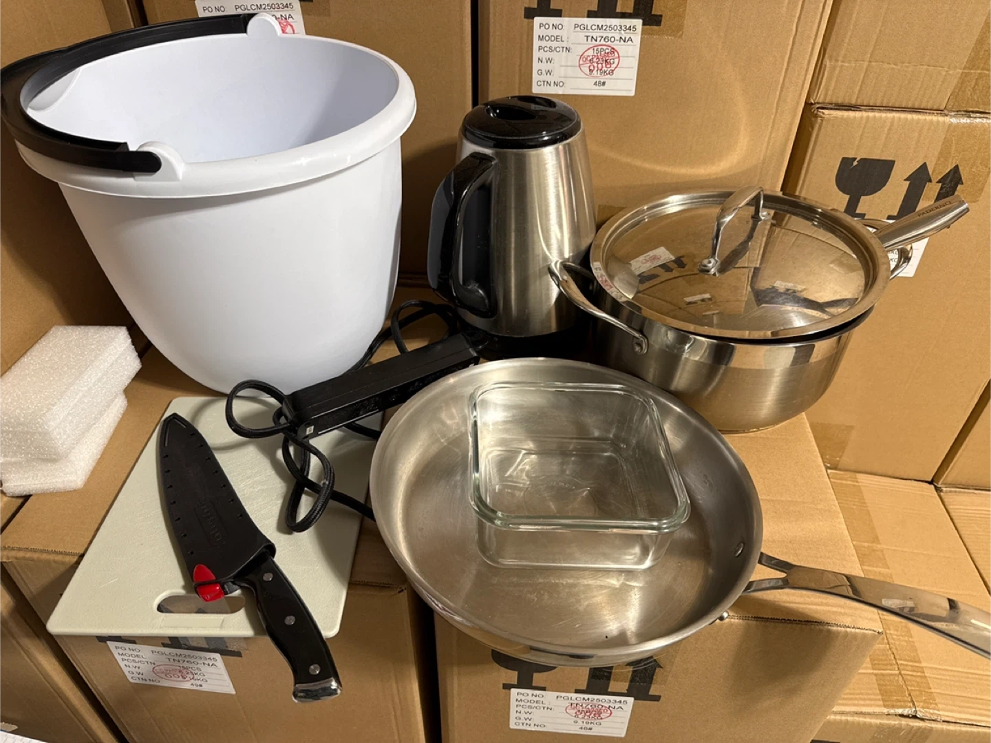 This kitchen set includes a stainless steel pot with lid, a frying pan with a glass dish, a stainless steel kettle, a cutting board, and a chef's knife. It's a great collection for home cooks!