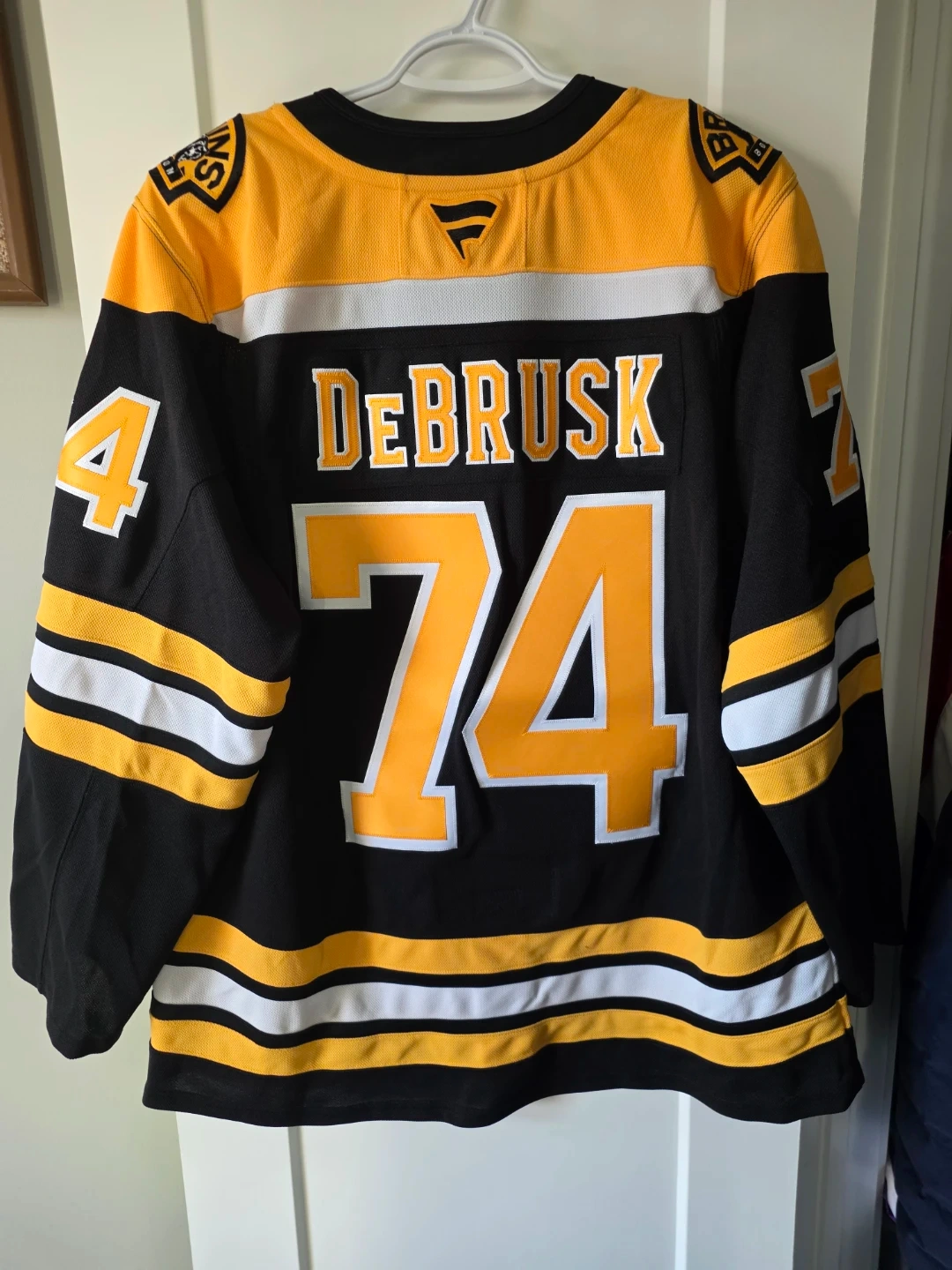 This is a Boston Bruins hockey jersey with DeBrusk's name and number 74, with tags on still. It's a Fanatics Premium Jersey with fight strap. XL