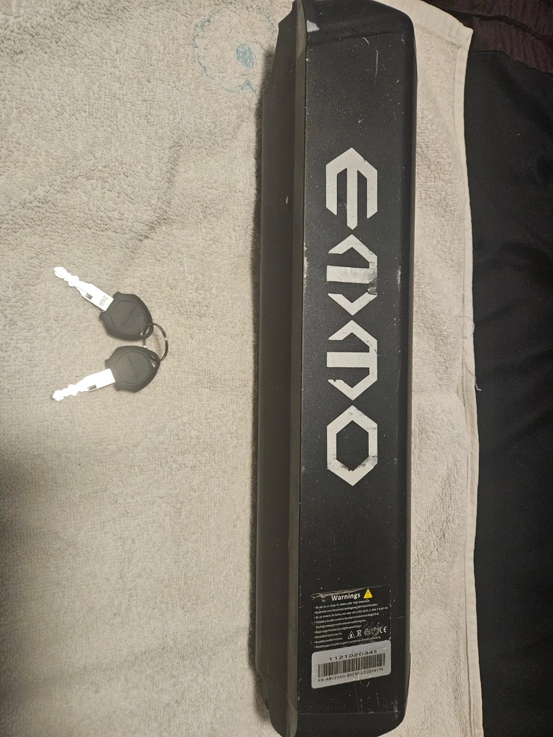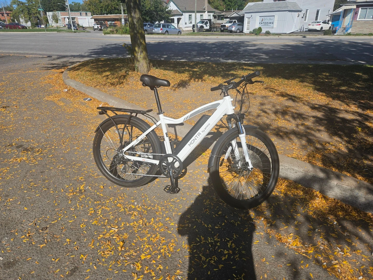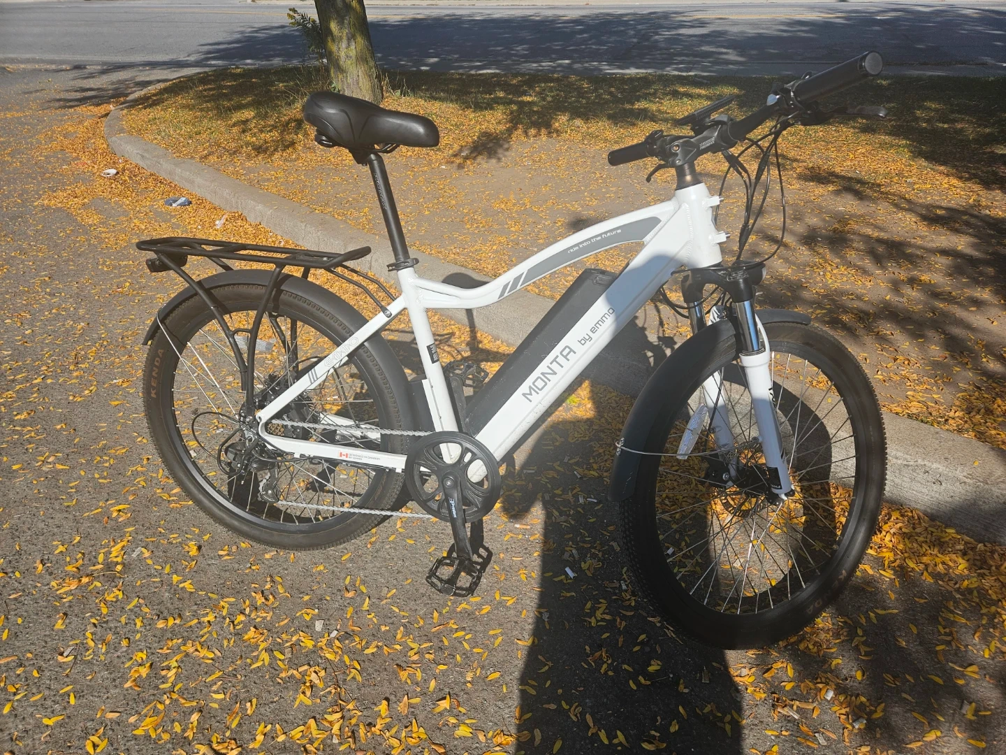 White electric EMMO MONTA. It has a digital display showing speed and trip distance. Includes a charger 2 keys and a waterproof cover. Has a 48v 21 ah battery good for about 100 km per charge