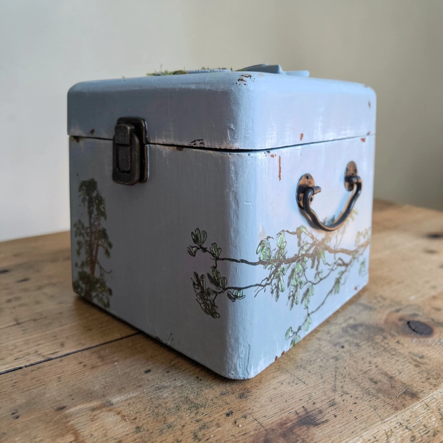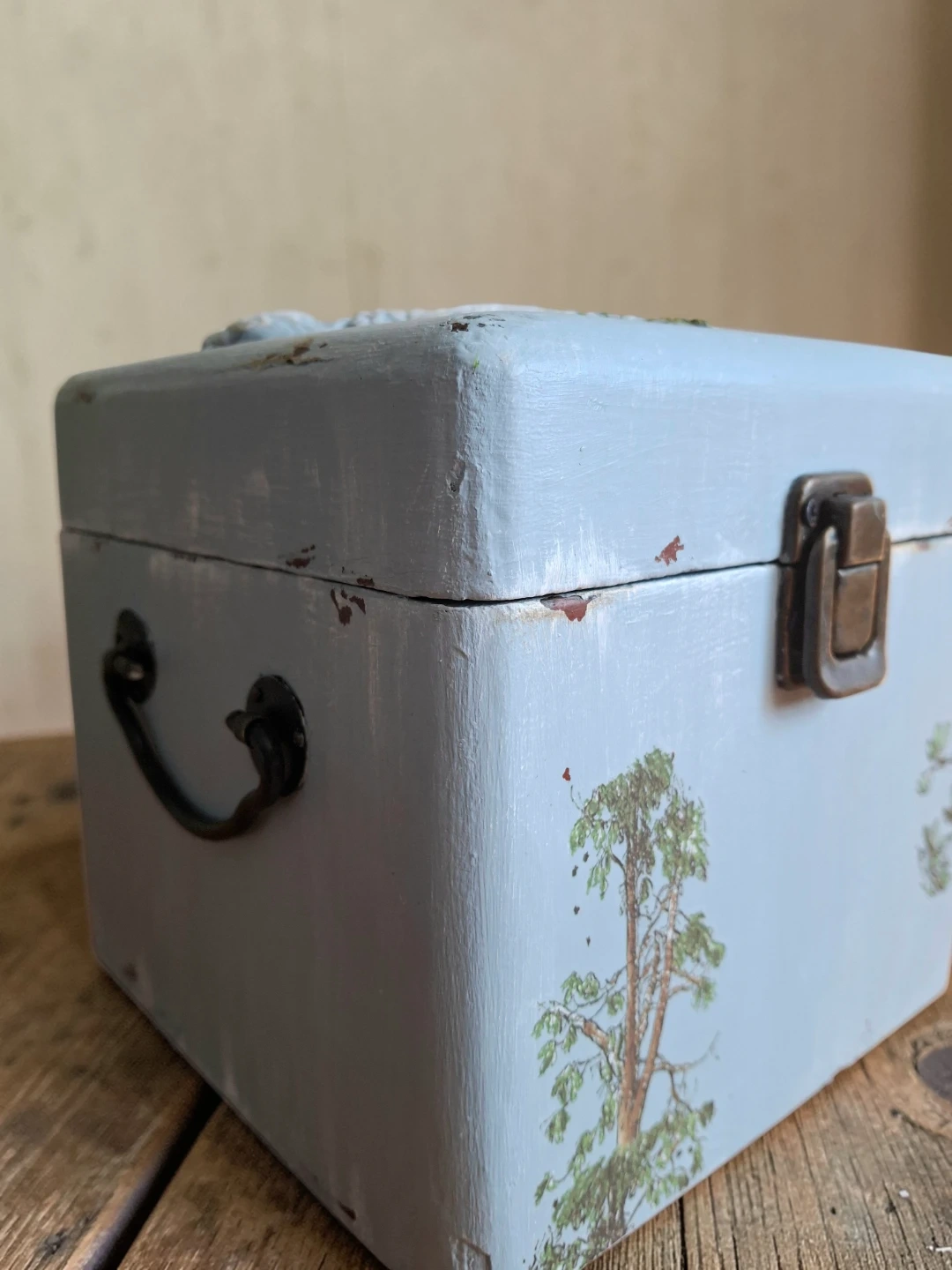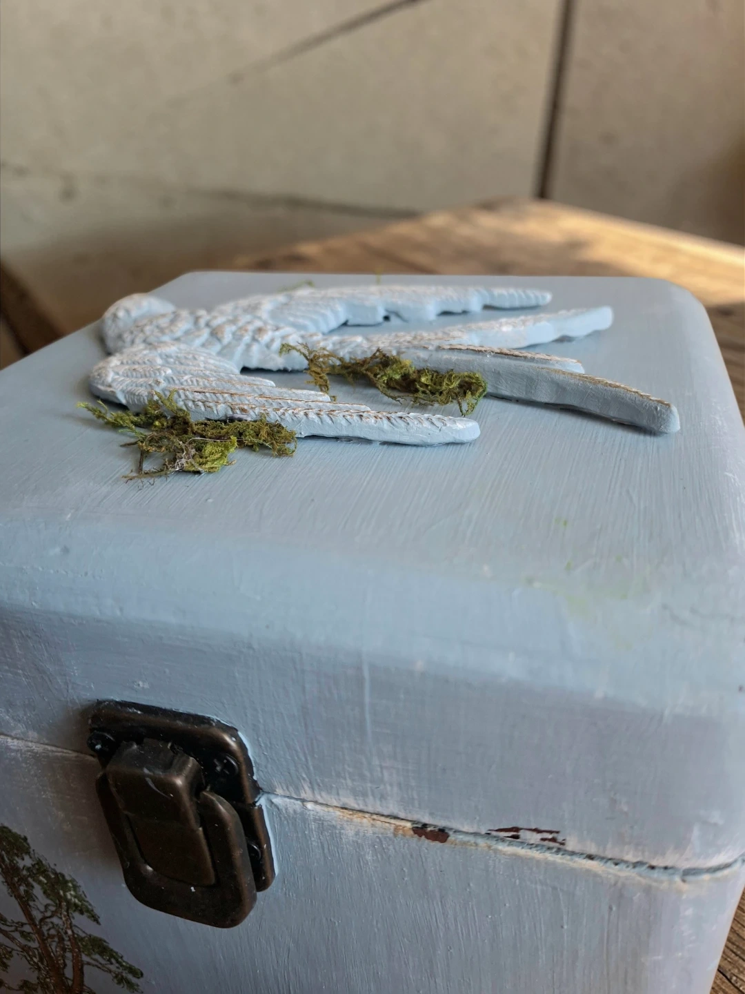 This charming decorative box is painted a soft blue and features a lovely bird relief on the lid. It's a great little container for trinkets or jewellery. The inside is also painted blue.