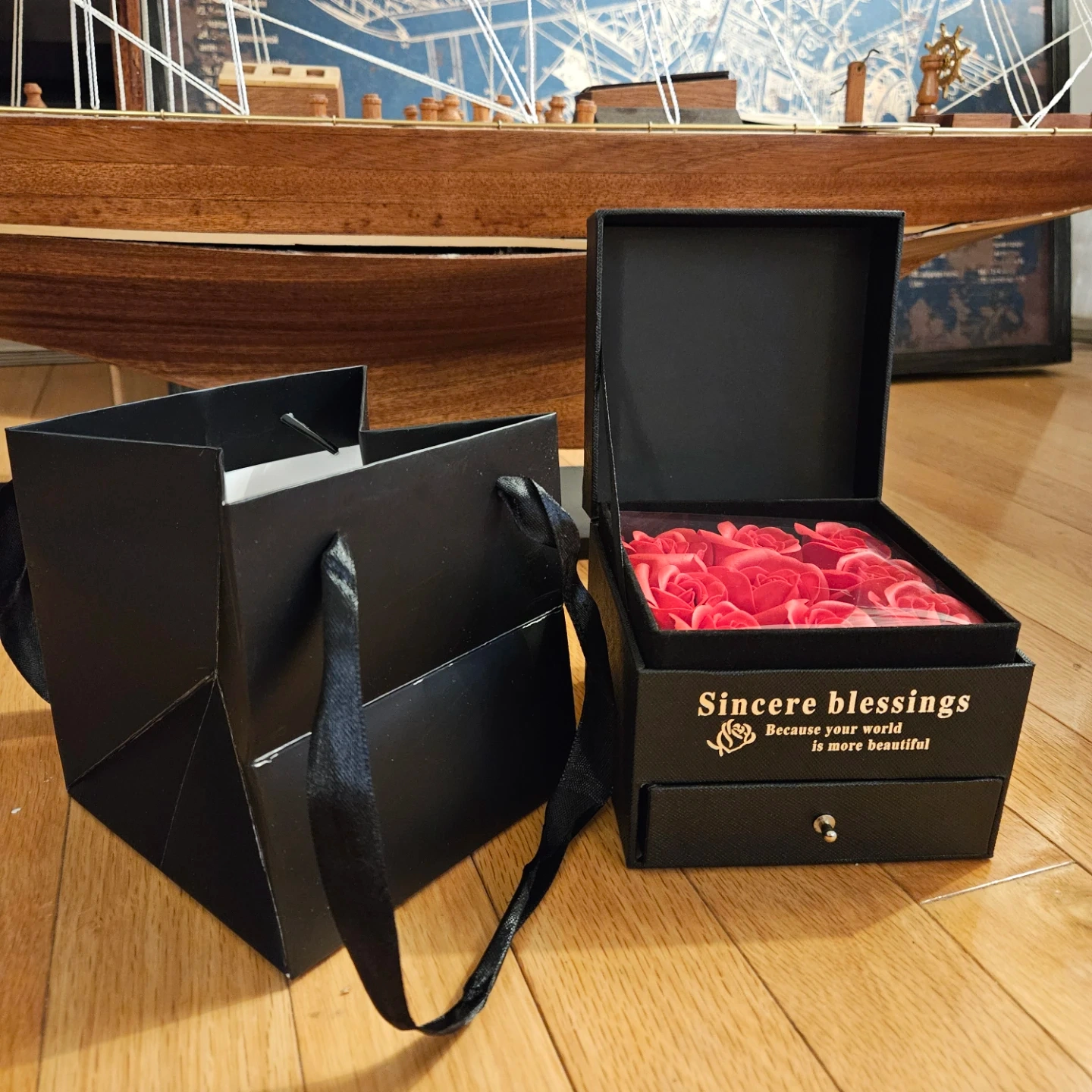 The Box: A beautiful black gift box featuring 9 scented soap roses that look and feel real but last forever. They have an incredible, long-lasting floral scent.