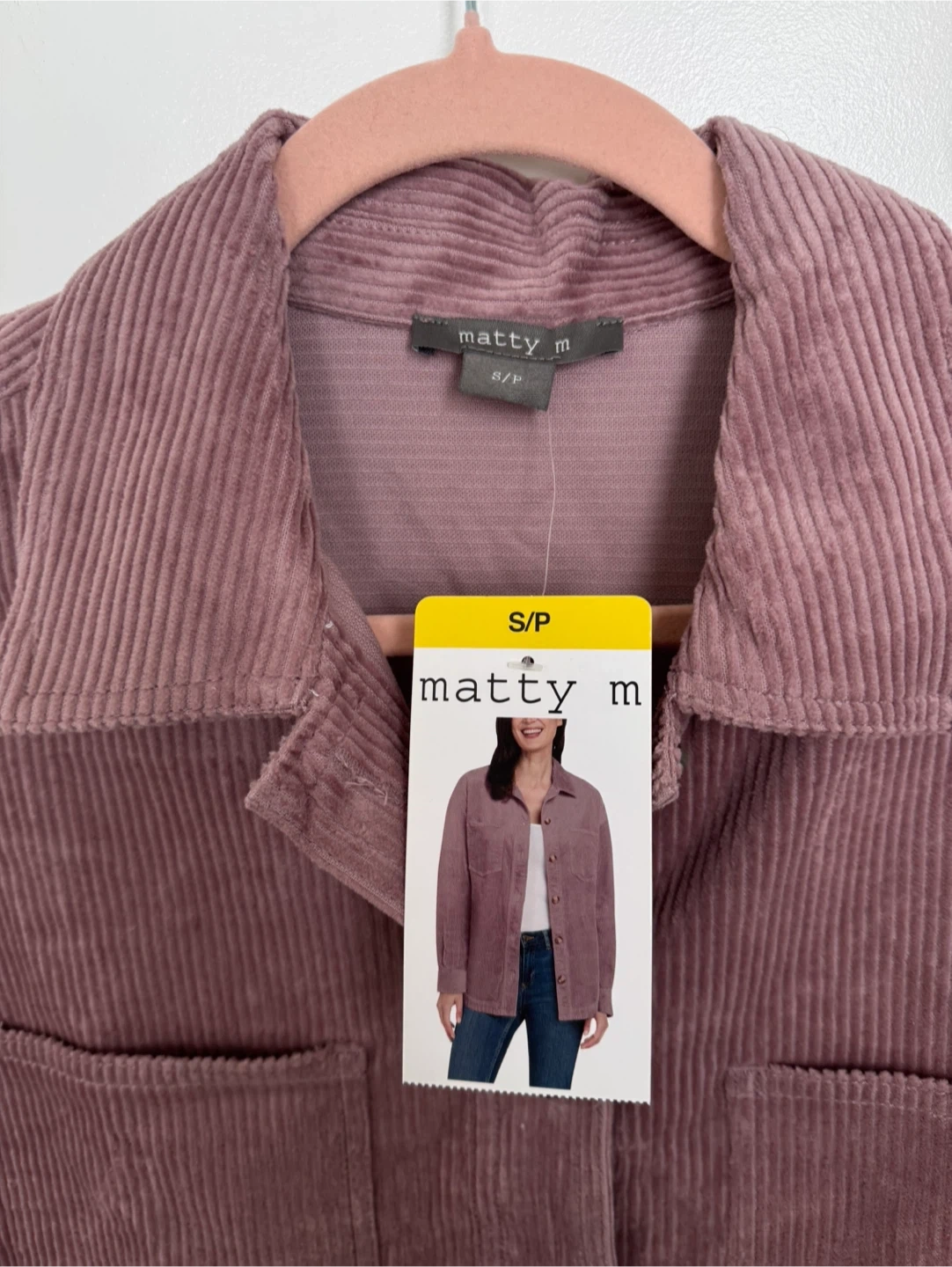 This is a Matty M corduroy shirt in a rose mauve colour. It's a size S/P. The shirt has button closures and two front pockets. Brand new with the tags on.