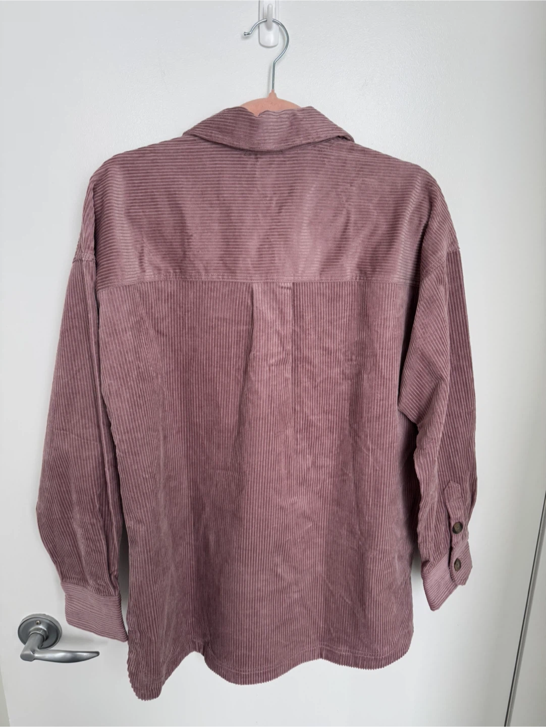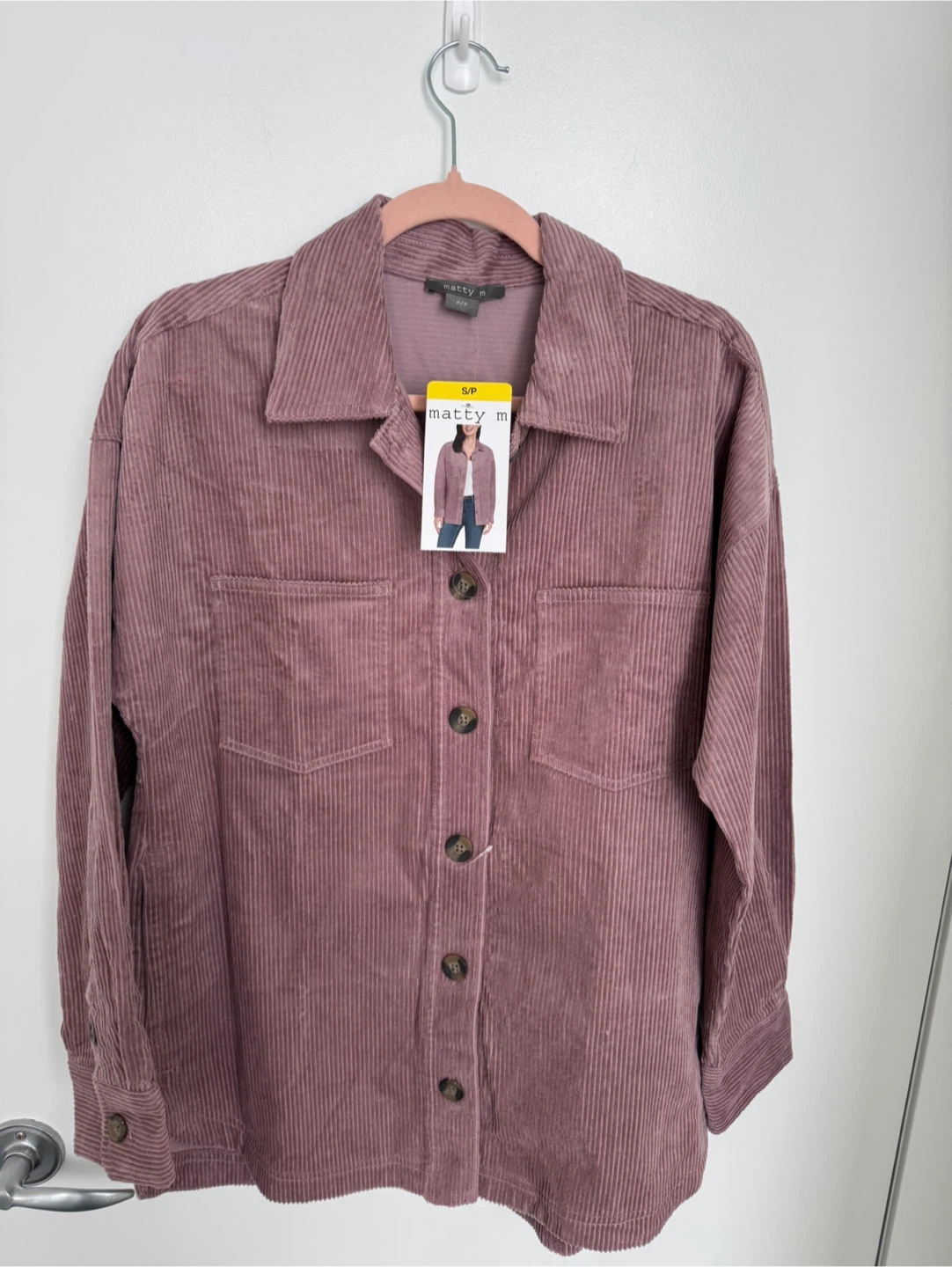 This is a Matty M corduroy shirt in a rose mauve colour. It's a size S/P. The shirt has button closures and two front pockets. Brand new with the tags on.