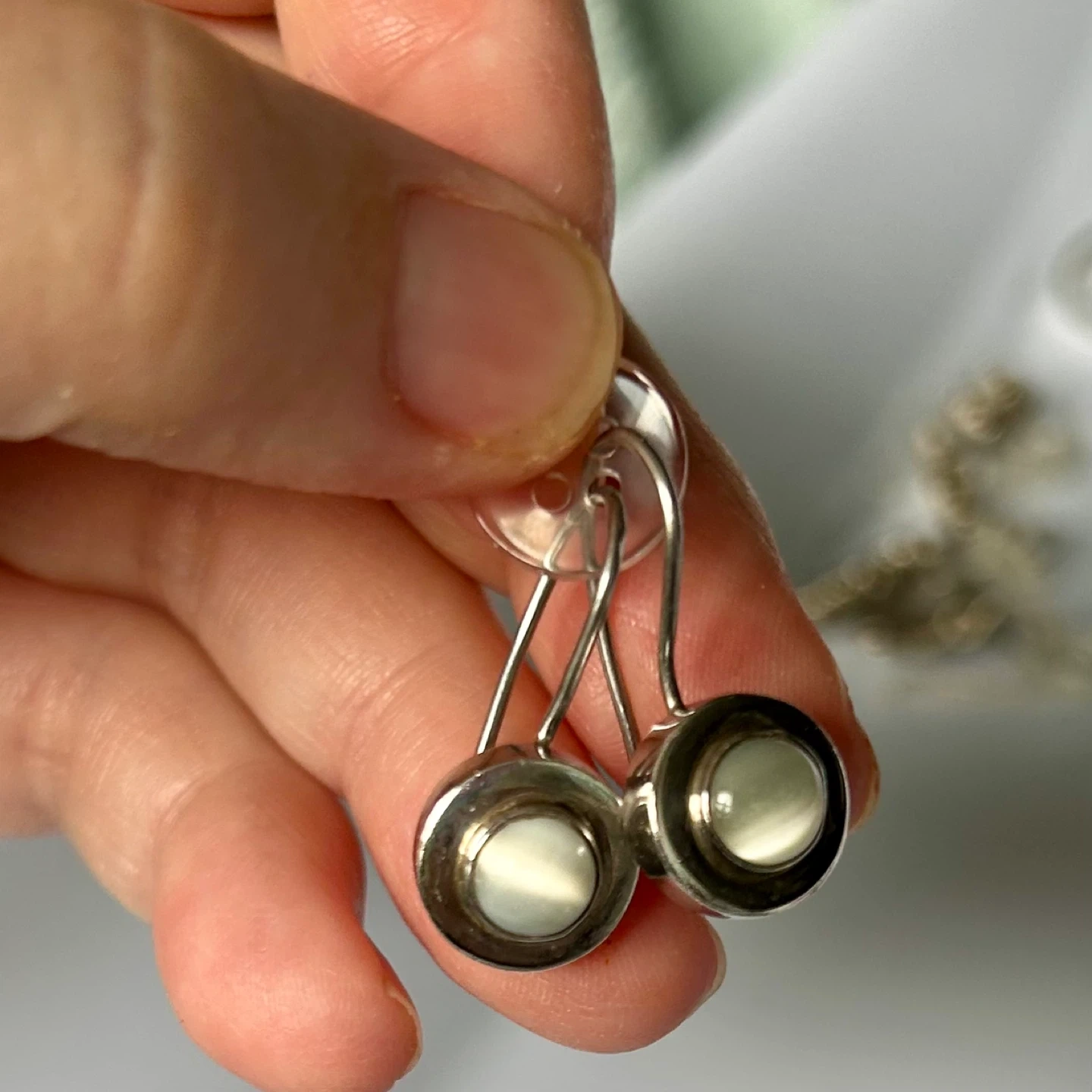 Silver drop earrings featuring a moonstone or cat's eye stone. These earrings are designed by Soul Flower. Canadian made!