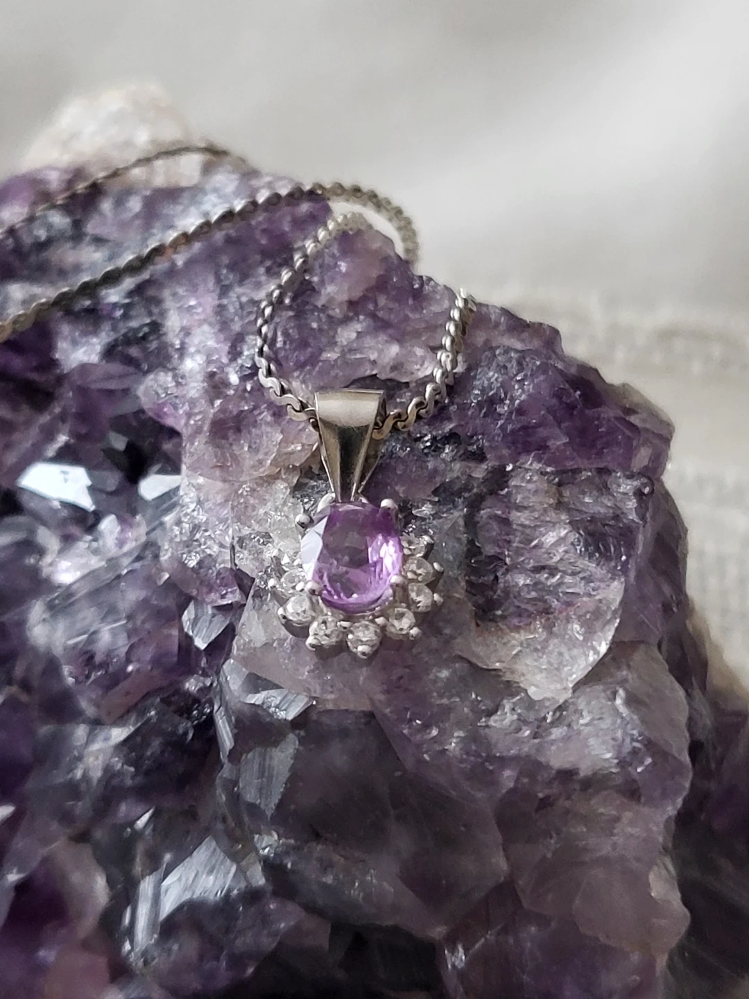 Sterling silver pendant necklace featuring an oval amethyst surrounded by small cubic zirconia stones. The chain is a delicate sterling silver stamped 925.