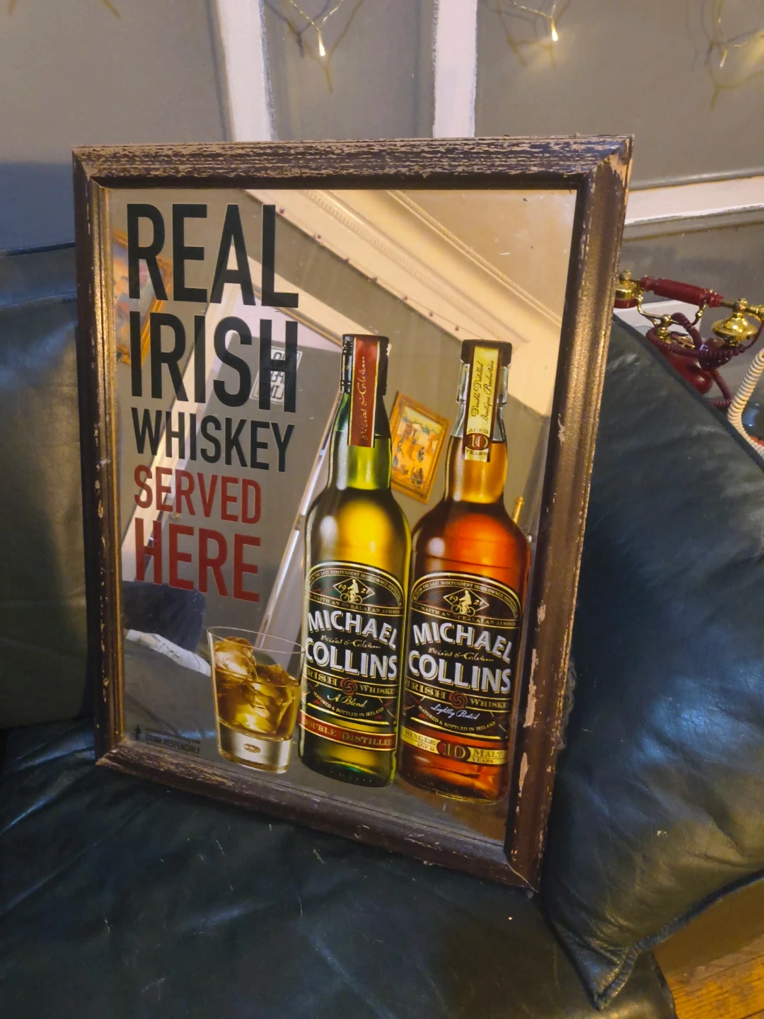 Vintage mirror featuring "Real Irish Whiskey Served Here" and "Michael Collins" branding. Promotes the iconic Irish whiskey. A great piece for a home bar or collector!