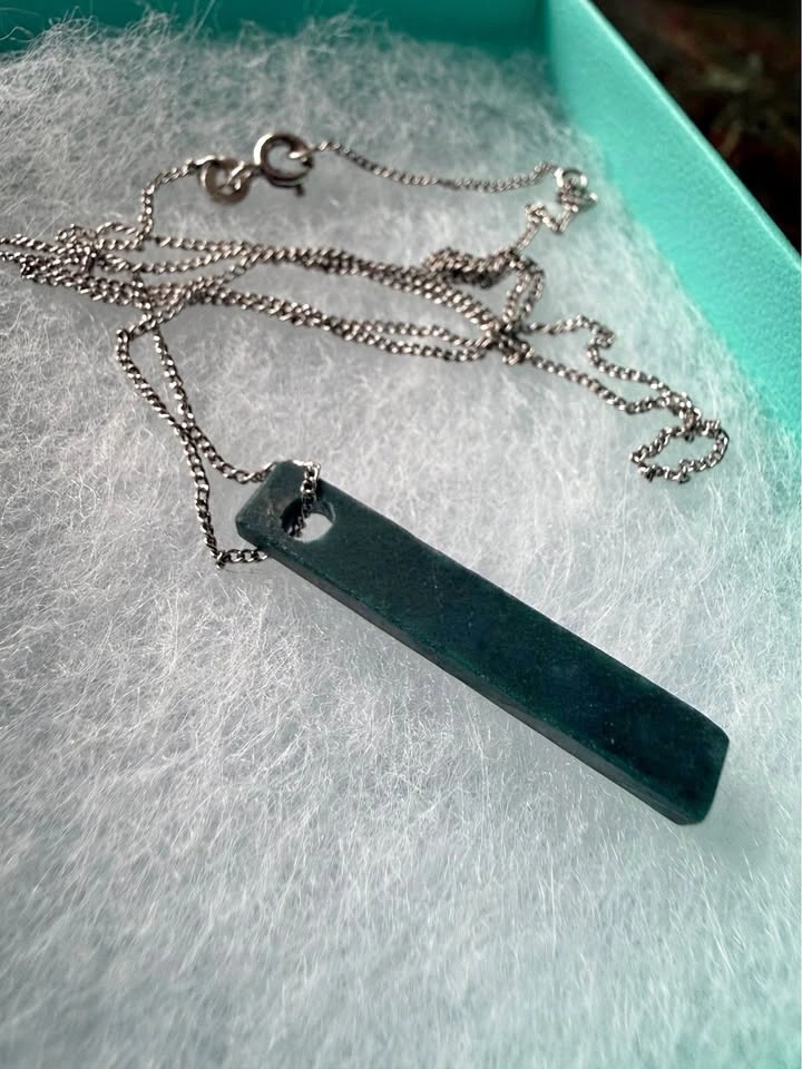 Handmade modern piece. Sterling silver stamped chain. The chain is used but the pendant is newly made. The gemstone is handmade hand polished African nephrite jade. Delicate size chain about 20-21 inches length including the extension. I have other pieces of sterling silver jewelry. Some vintage, some new, and some handmade items. Pick up downtown near Queen and Spadina.