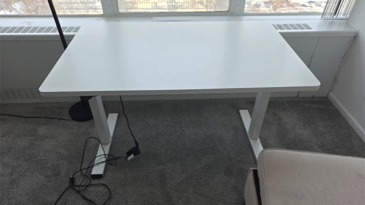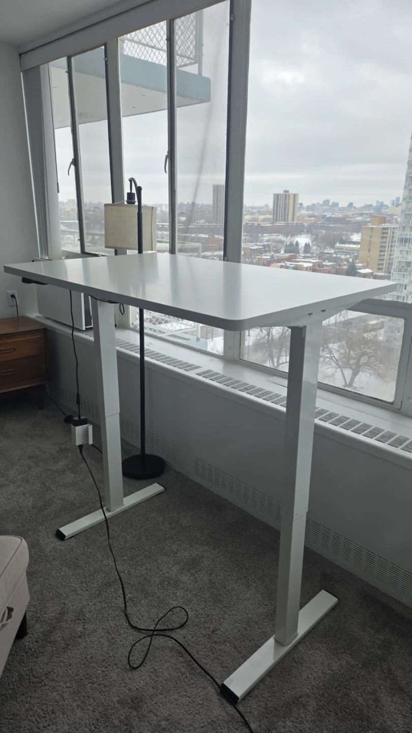 White standing desk with adjustable height. White tabletop with white metal legs. This desk is perfect for any home office setup!