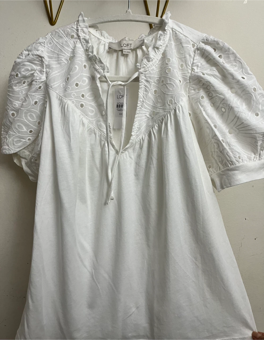 This is a white peasant-style blouse from LOFT. It features short puff sleeves with eyelet embroidery and a ruffled neckline with a tie closure. It's made of a lightweight fabric perfect for warmer weather.