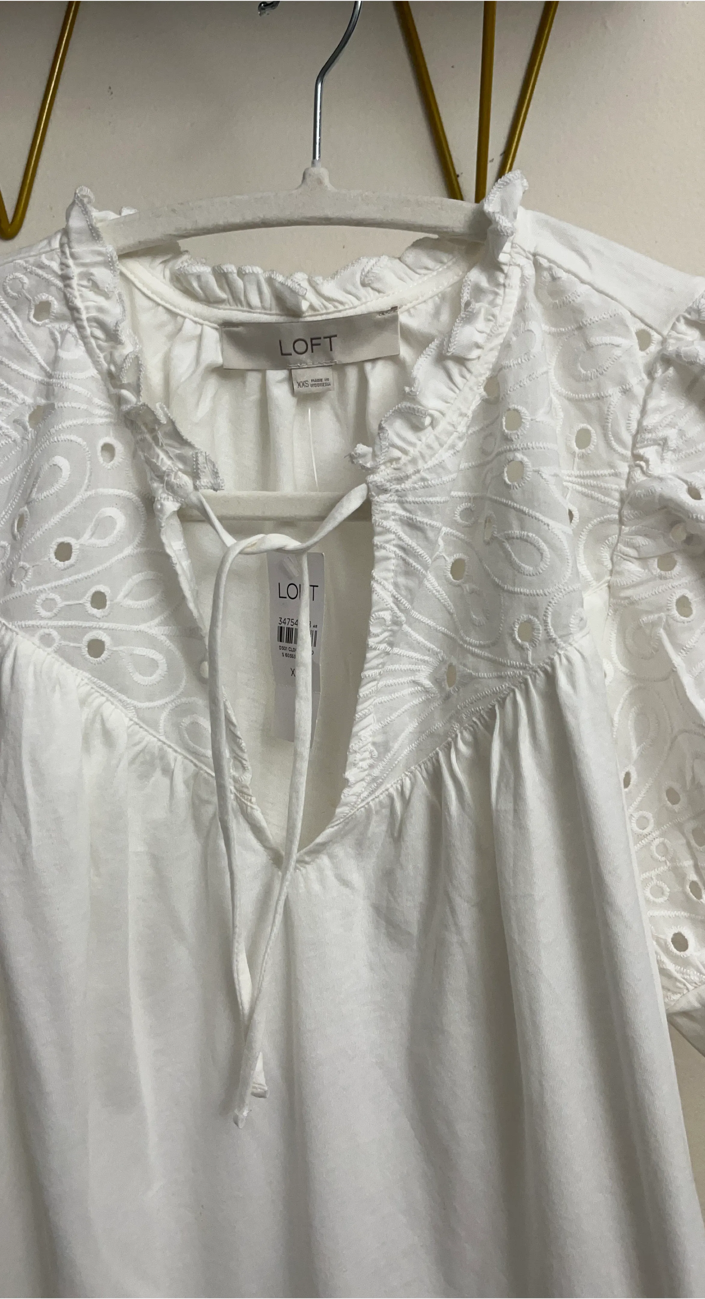 This is a white peasant-style blouse from LOFT. It features short puff sleeves with eyelet embroidery and a ruffled neckline with a tie closure. It's made of a lightweight fabric perfect for warmer weather.