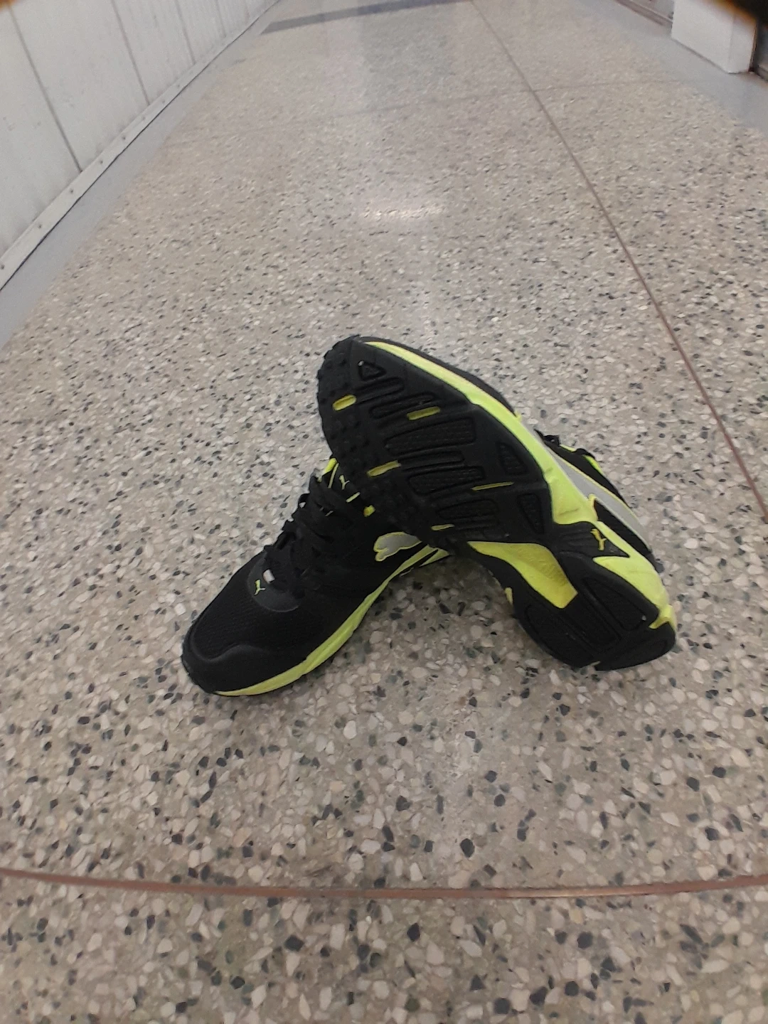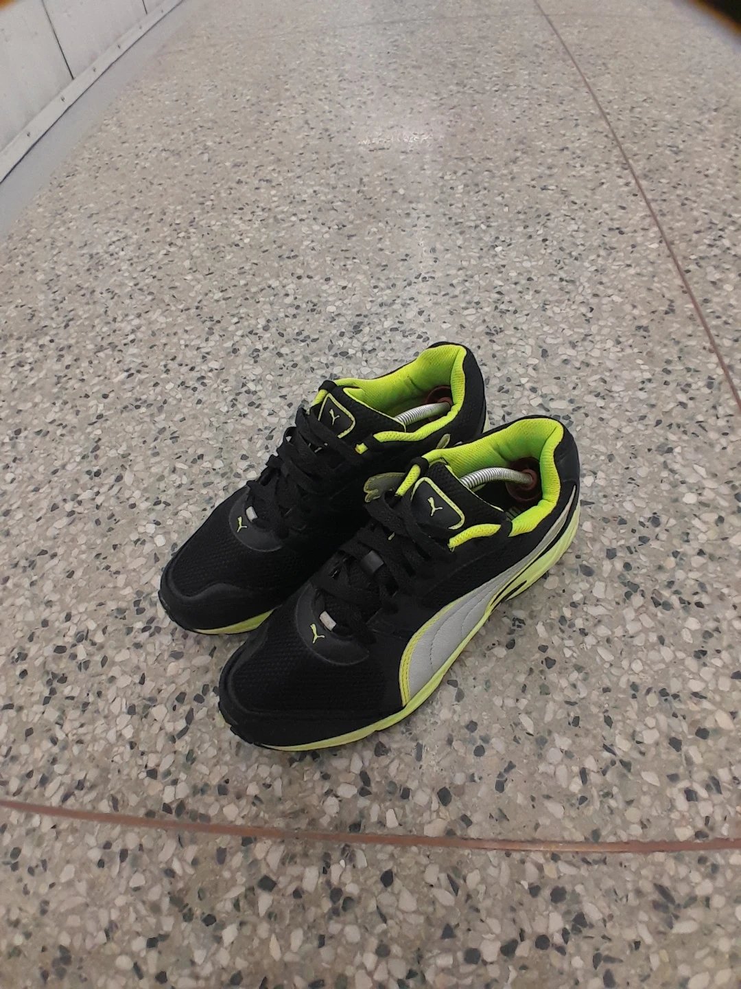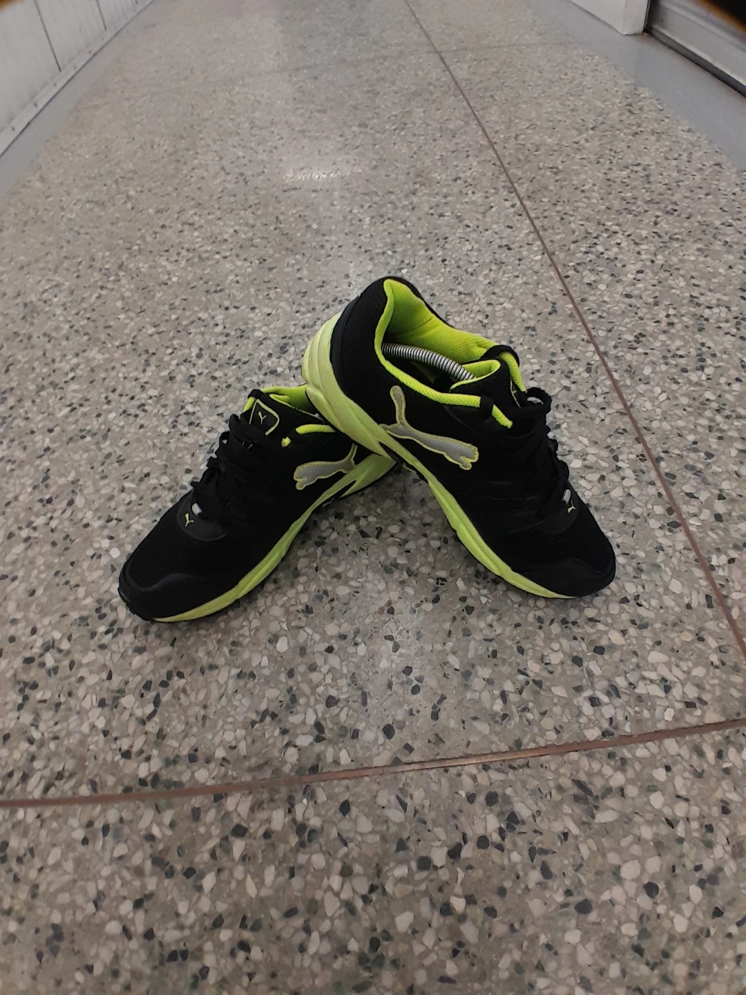 Puma running shoes in black with neon accents. Features a breathable mesh upper and cushioned sole for comfort. Great for workouts or casual wear! Men's Size 8.5