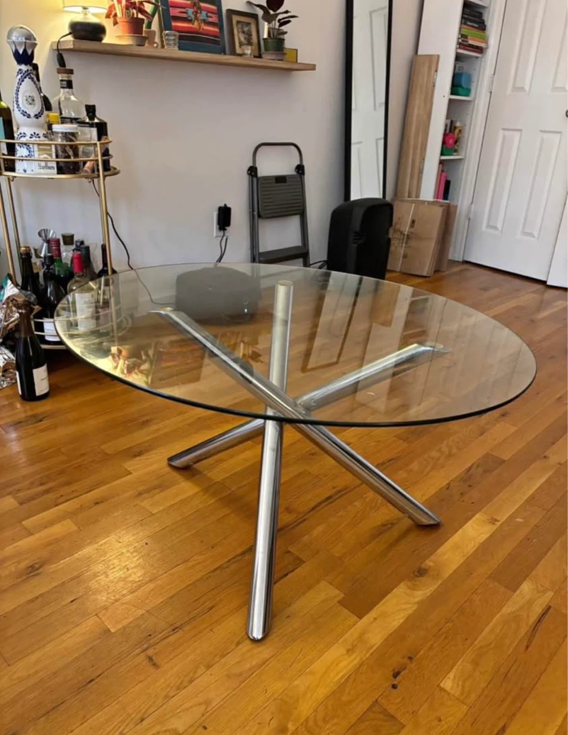 Selling a glass top coffee table with a unique chrome base. It's in great condition and would be a stylish addition to any living room! The glass is clear and the chrome is shiny, making it a real eye-catcher
