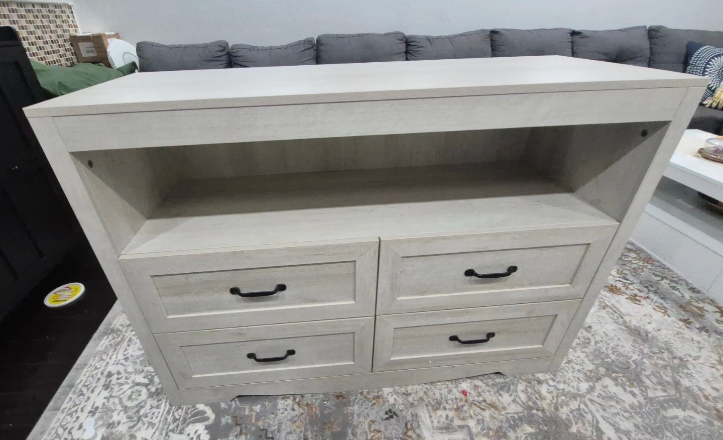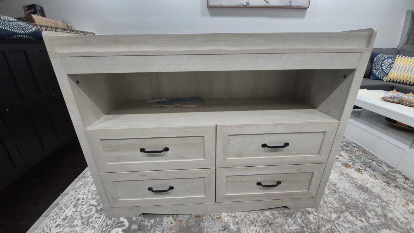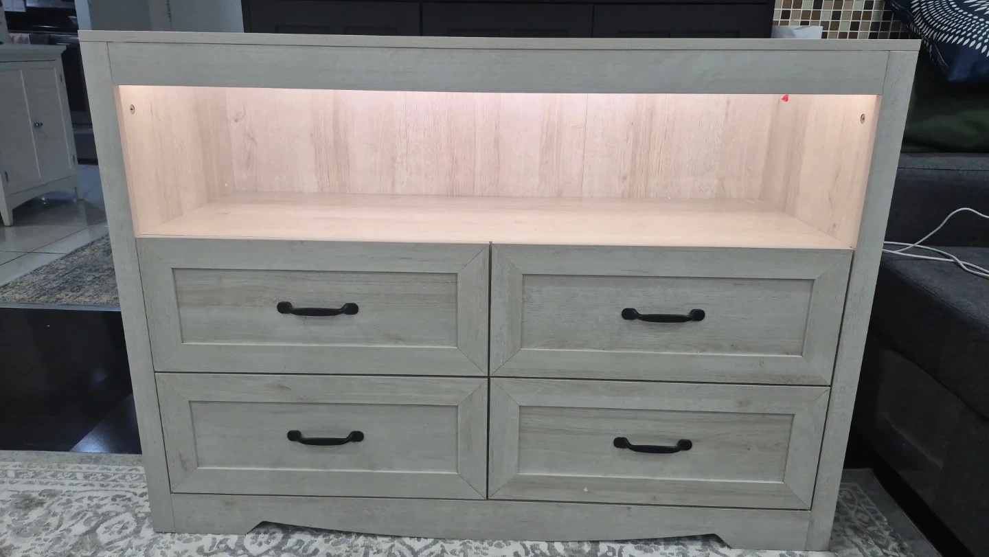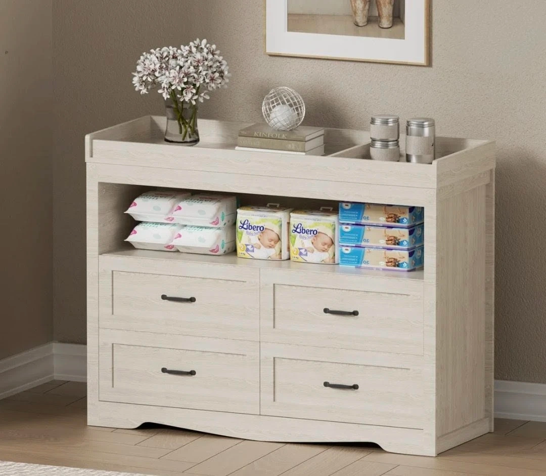 This white changing table dresser features four drawers for storage and an open shelf space. It has integrated LED lighting above the shelf. The recommended weight limit for the changing surface is This multifunctional white baby dresser is perfect for various spaces like bedrooms and children's rooms. It serves as a changing table, ideal for diaper changes, massages, and dressing, and can also be used for decorative purposes once the changing table top is removed. With ample storage, including 4 large drawers and 1 open shelf, it provides space for clothes, toys, and baby products. The built-in light strip ensures convenience in low-light settings. Designed for safety and comfort, it features an anti-tipping function and ergonomic design. Easy to clean and assemble, it offers a practical solution for busy parents.