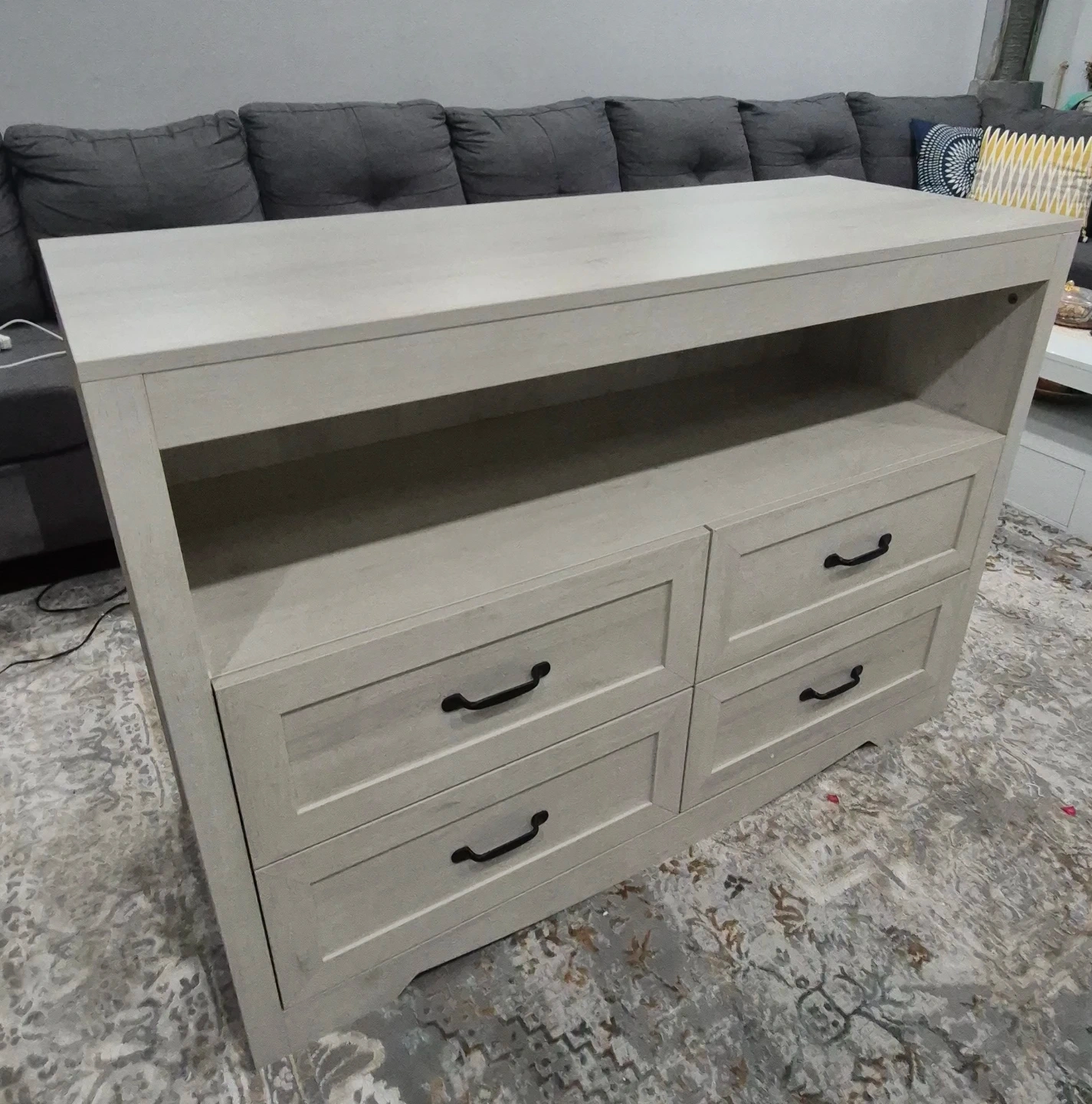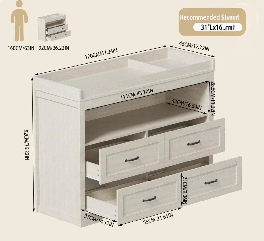 This white changing table dresser features four drawers for storage and an open shelf space. It has integrated LED lighting above the shelf. The recommended weight limit for the changing surface is This multifunctional white baby dresser is perfect for various spaces like bedrooms and children's rooms. It serves as a changing table, ideal for diaper changes, massages, and dressing, and can also be used for decorative purposes once the changing table top is removed. With ample storage, including 4 large drawers and 1 open shelf, it provides space for clothes, toys, and baby products. The built-in light strip ensures convenience in low-light settings. Designed for safety and comfort, it features an anti-tipping function and ergonomic design. Easy to clean and assemble, it offers a practical solution for busy parents.