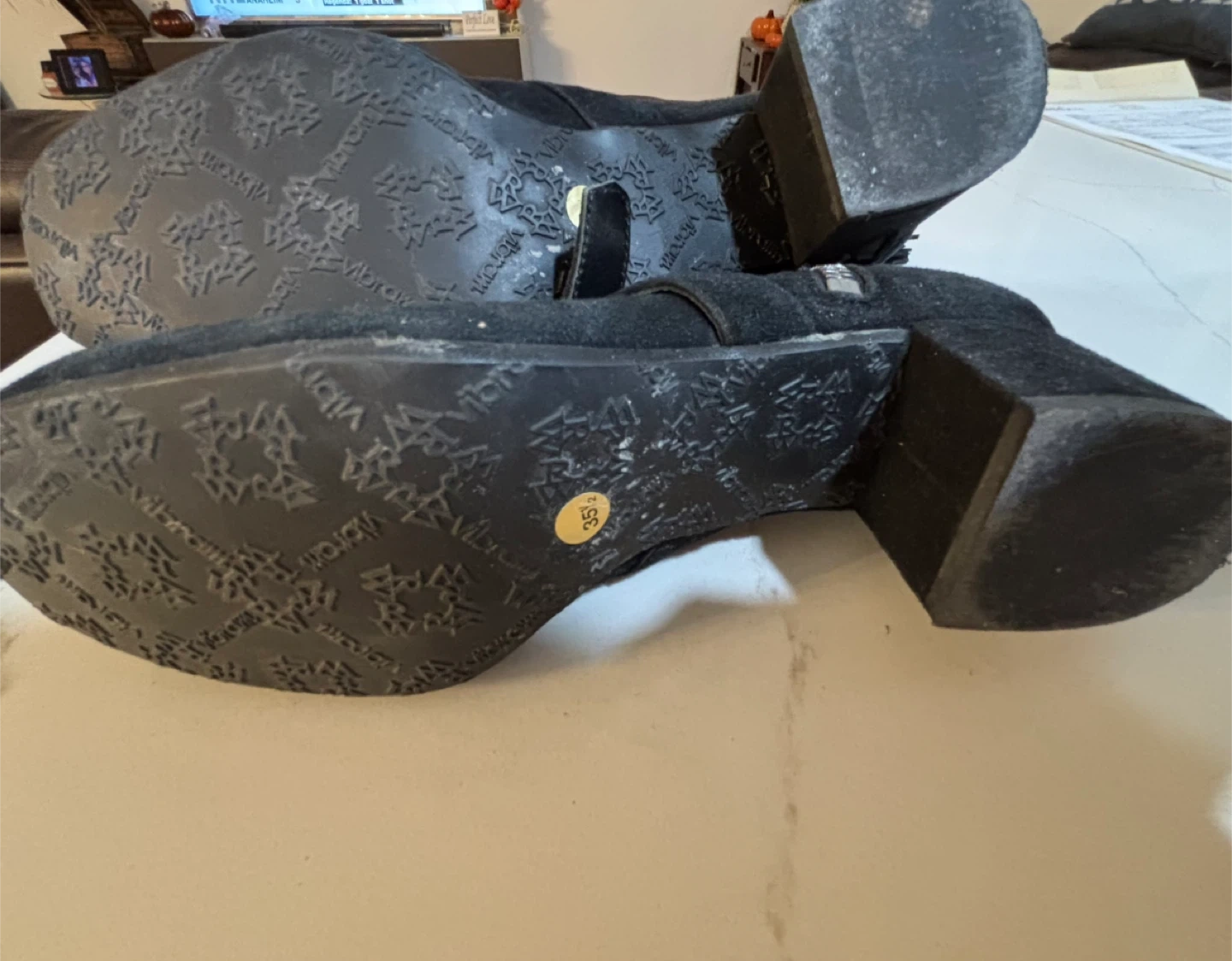 Selling a pair of Ron White black suede ankle boots in size 35.5. These boots feature a stylish buckle strap and a tassel detail on the zipper. They're in good condition and ready for a new home!