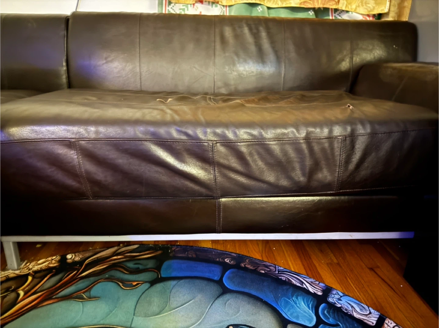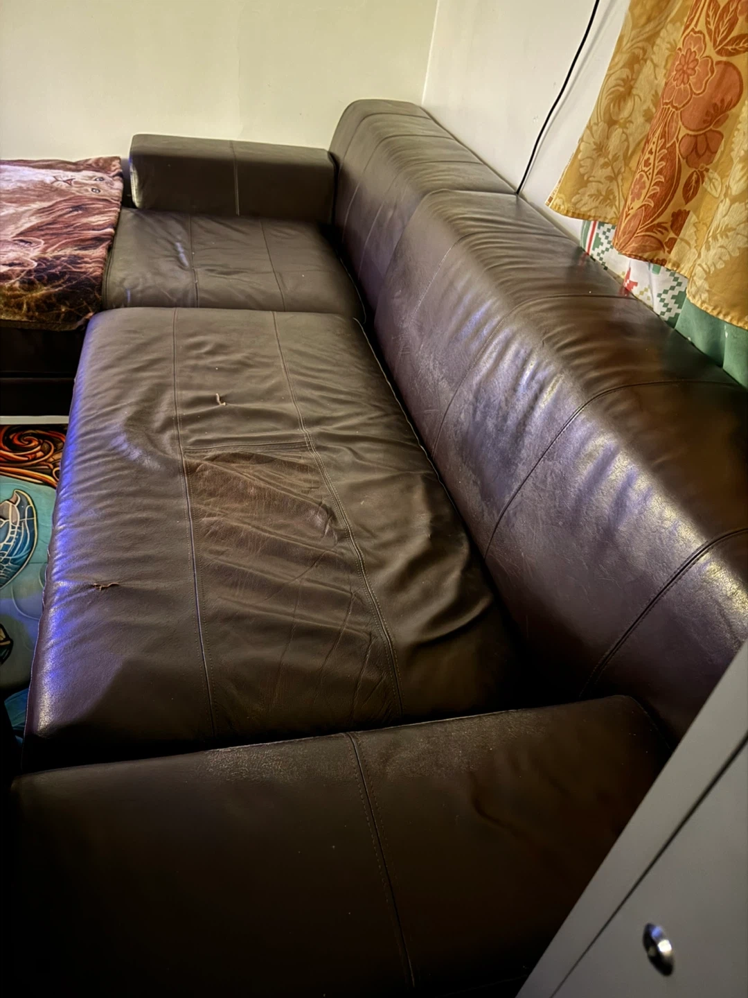 Selling a brown leather sectional sofa. It's got a classic look and is super comfy for lounging. It does show some signs of wear, but still has lots of life left in it