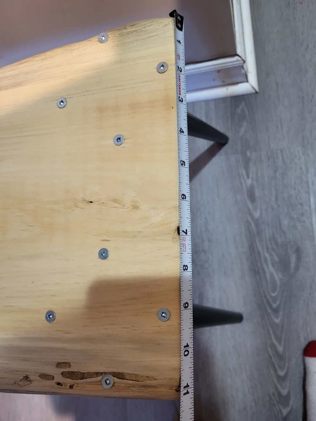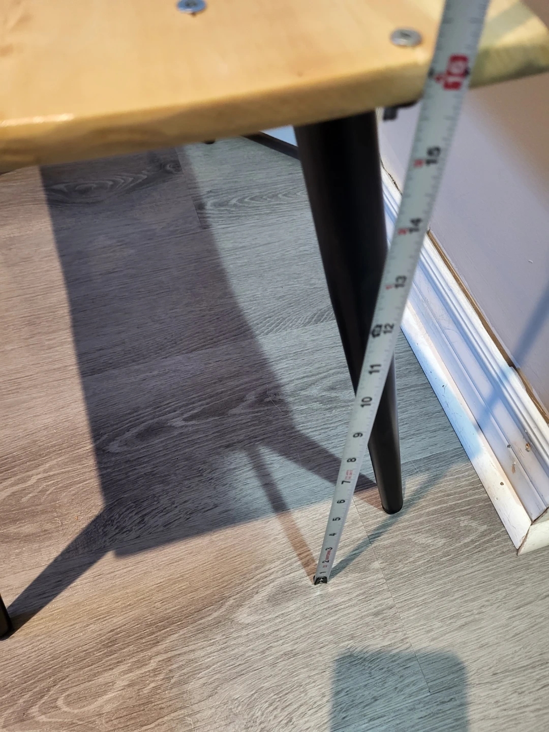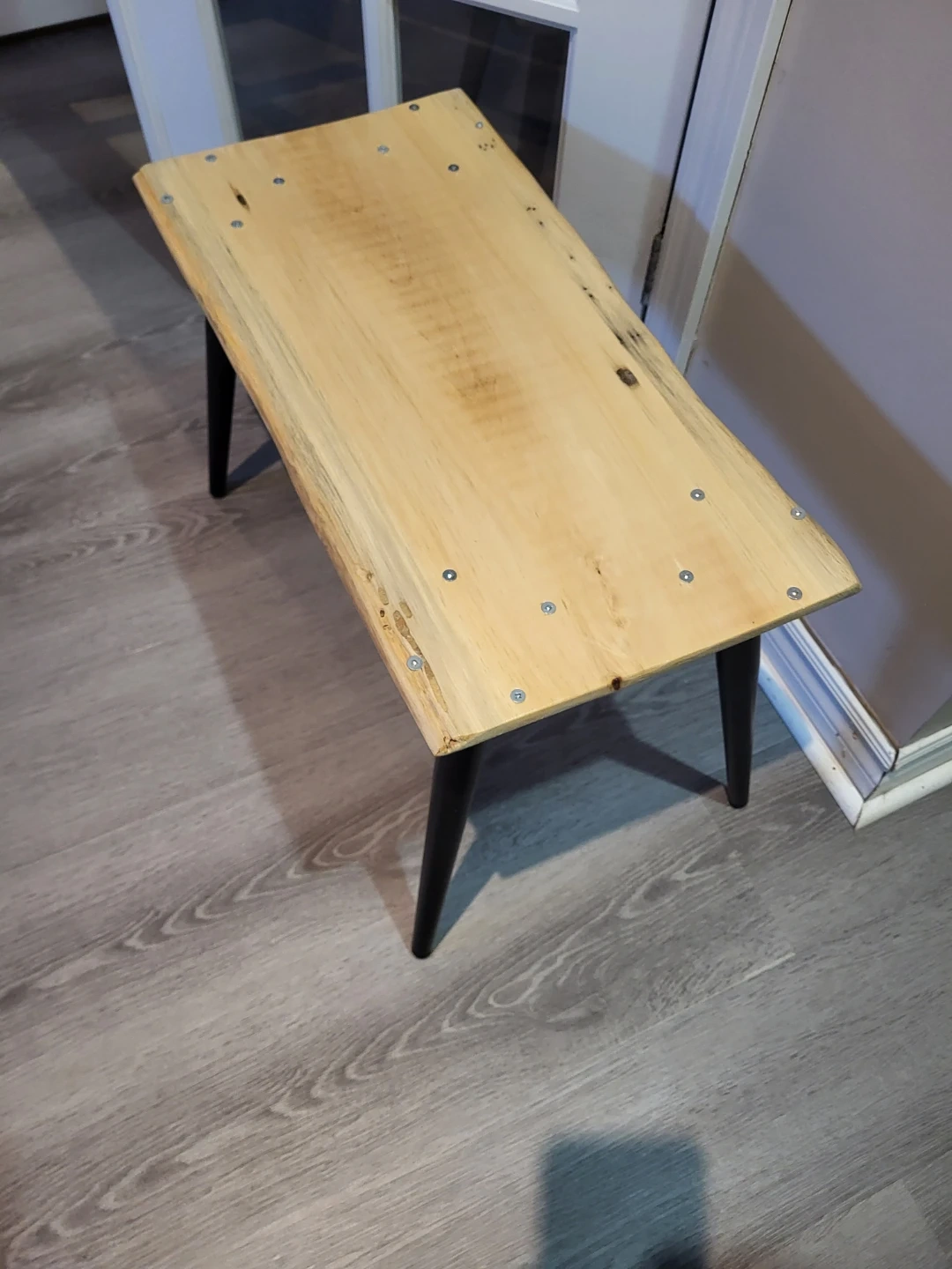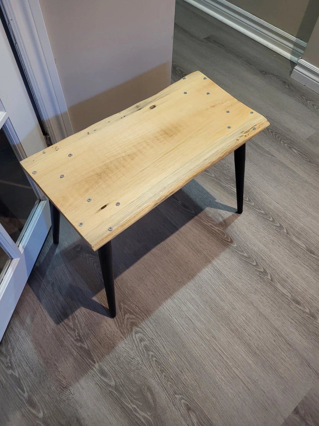 Here's a cute little handmade wooden plant stand! The top is a light wood, and the legs are black. It's about 22 inches long, 11 inches wide, and stands about 16 inches tall. Perfect as a small side table.