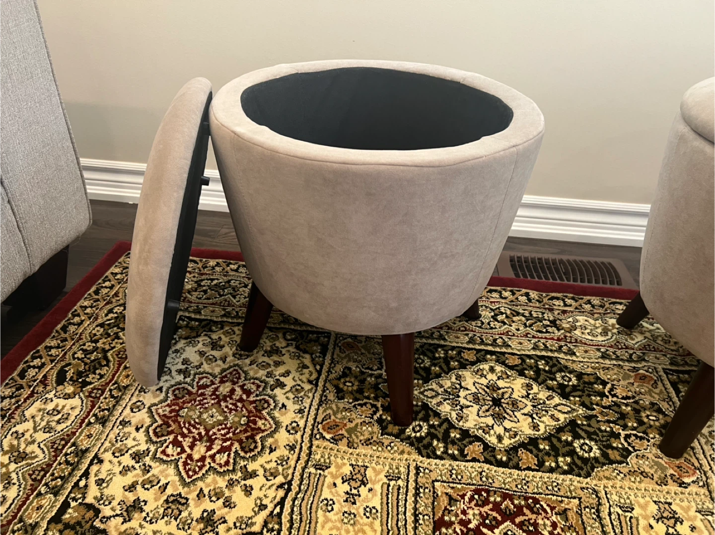 Selling a set of two storage ottoman stools. They're in great shape and perfect for adding extra seating and storage to any room. The neutral colour ensures they'll fit in with any decor