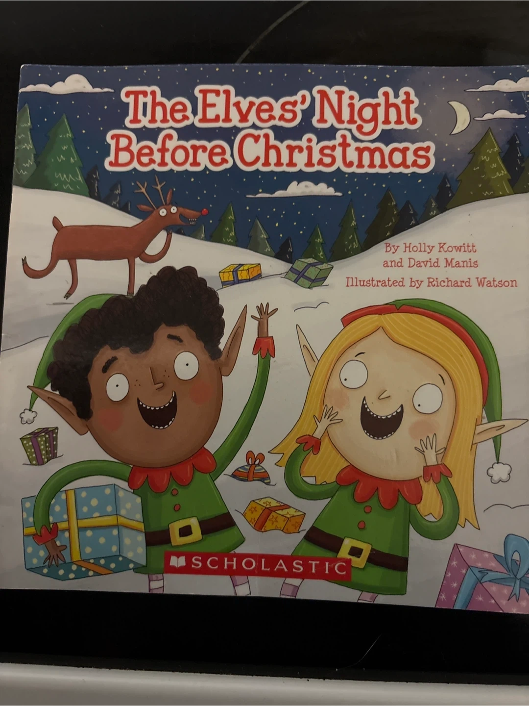 A children's book titled The Elves' Night Before Christmas. Written by Holly Kowitt and David Manis, with illustrations by Richard Watson. This book is published by Scholastic. It's a fun Christmas story for kids!