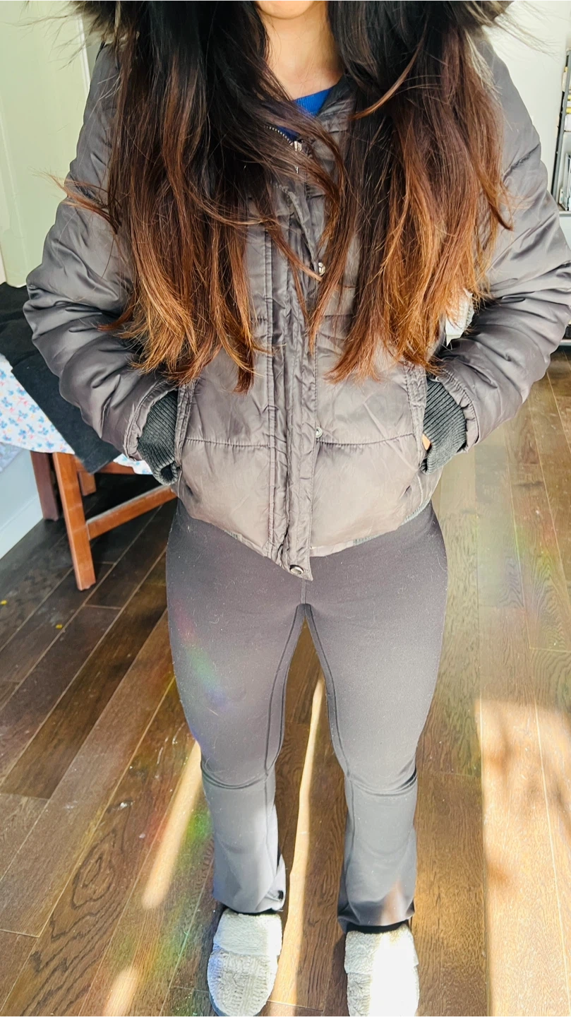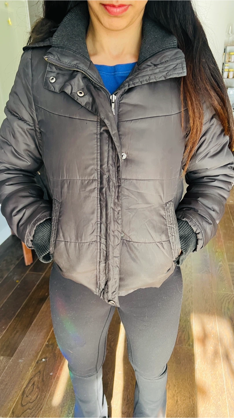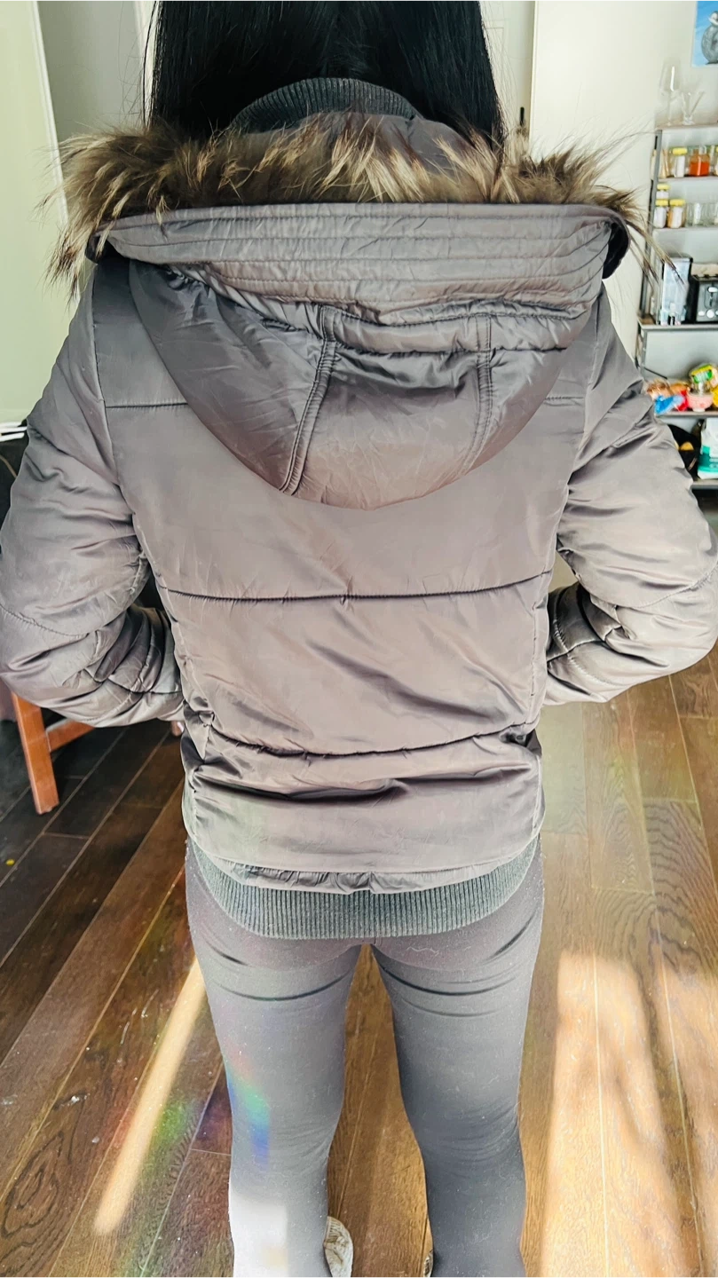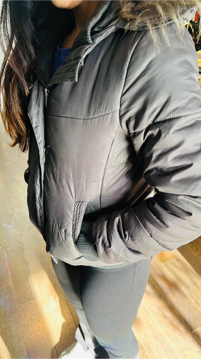Warm puffer jacket in a dark gray color. It features a zip and snap front closure with two front pockets. The hood is trimmed with faux fur. Ribbed cuffs and hem for a snug fit.