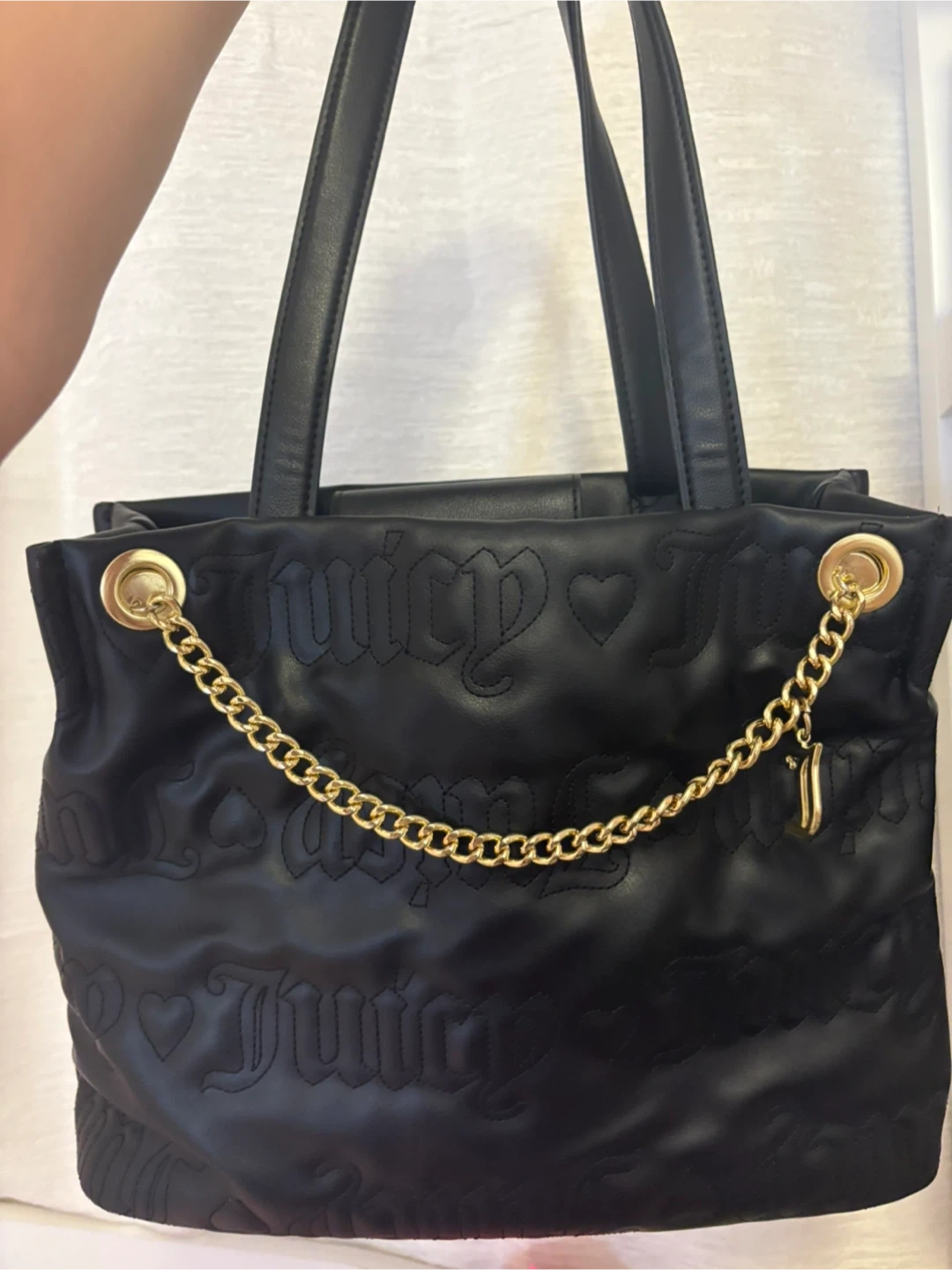 Selling a black Juicy Couture tote bag! It's in great condition and features the Juicy Couture logo embossed on the exterior. The inside lining has the Juicy Couture print as well. Perfect for everyday use!