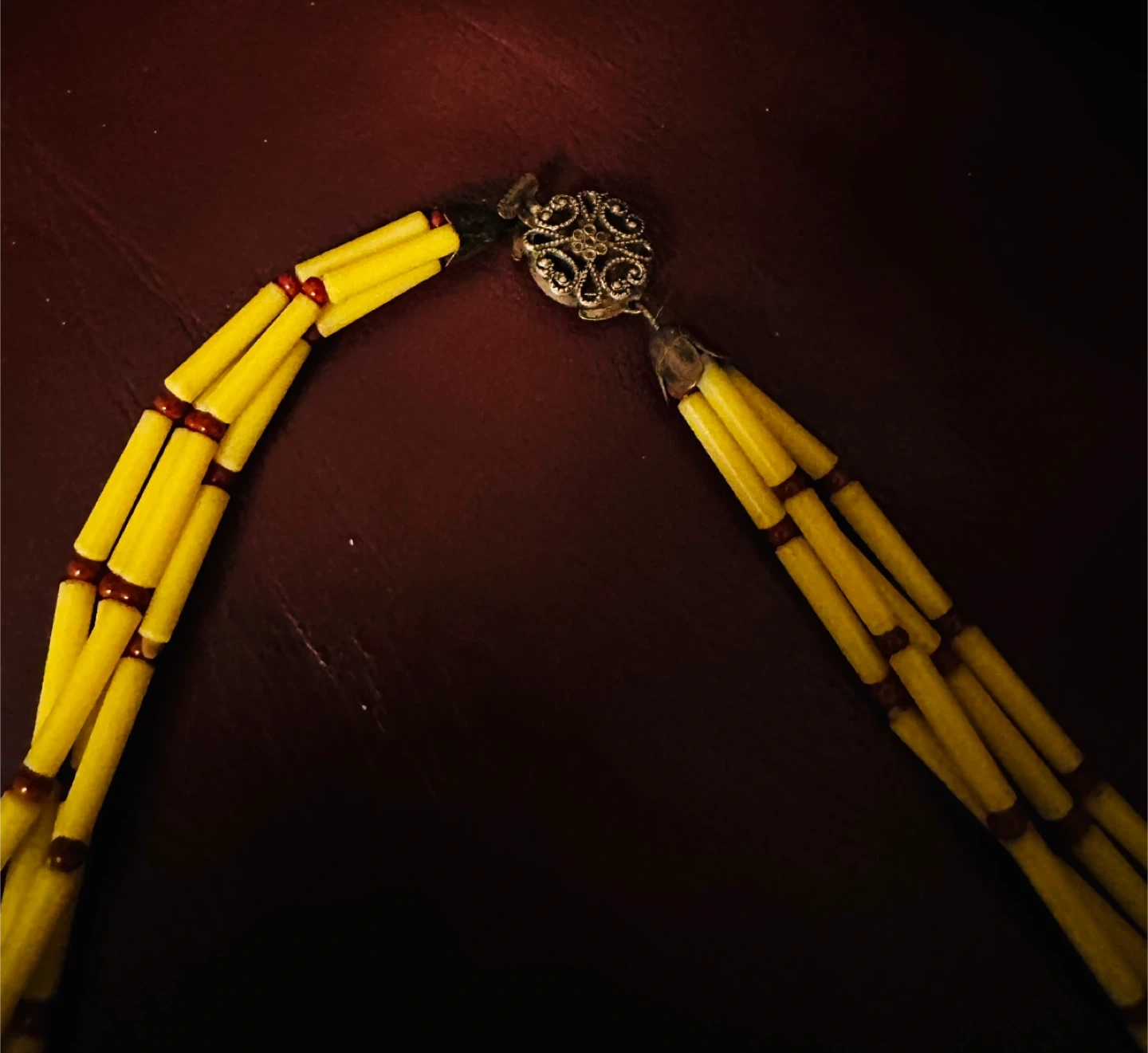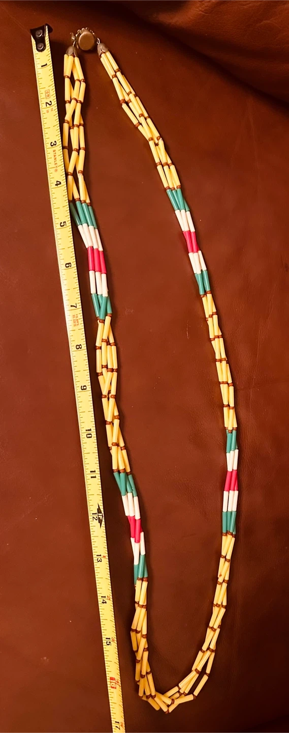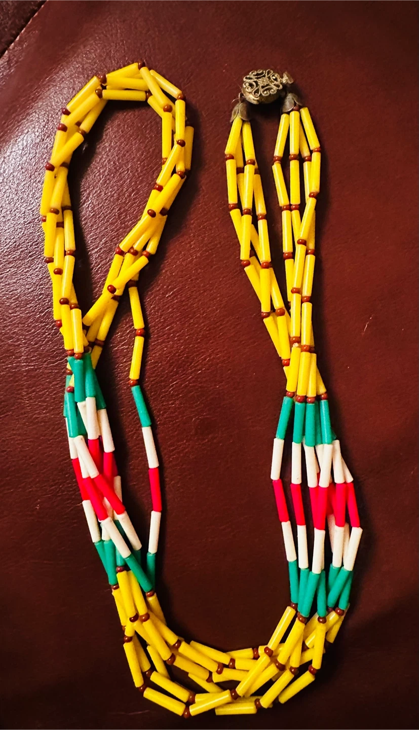 This necklace features multiple strands of yellow tube beads with smaller brown beads in between. Sections of white, red, and green beads add color. It has a decorative clasp. Approximately 17 inches long when laid flat.