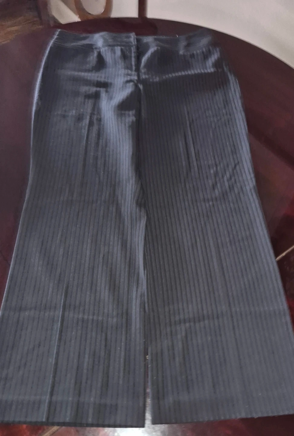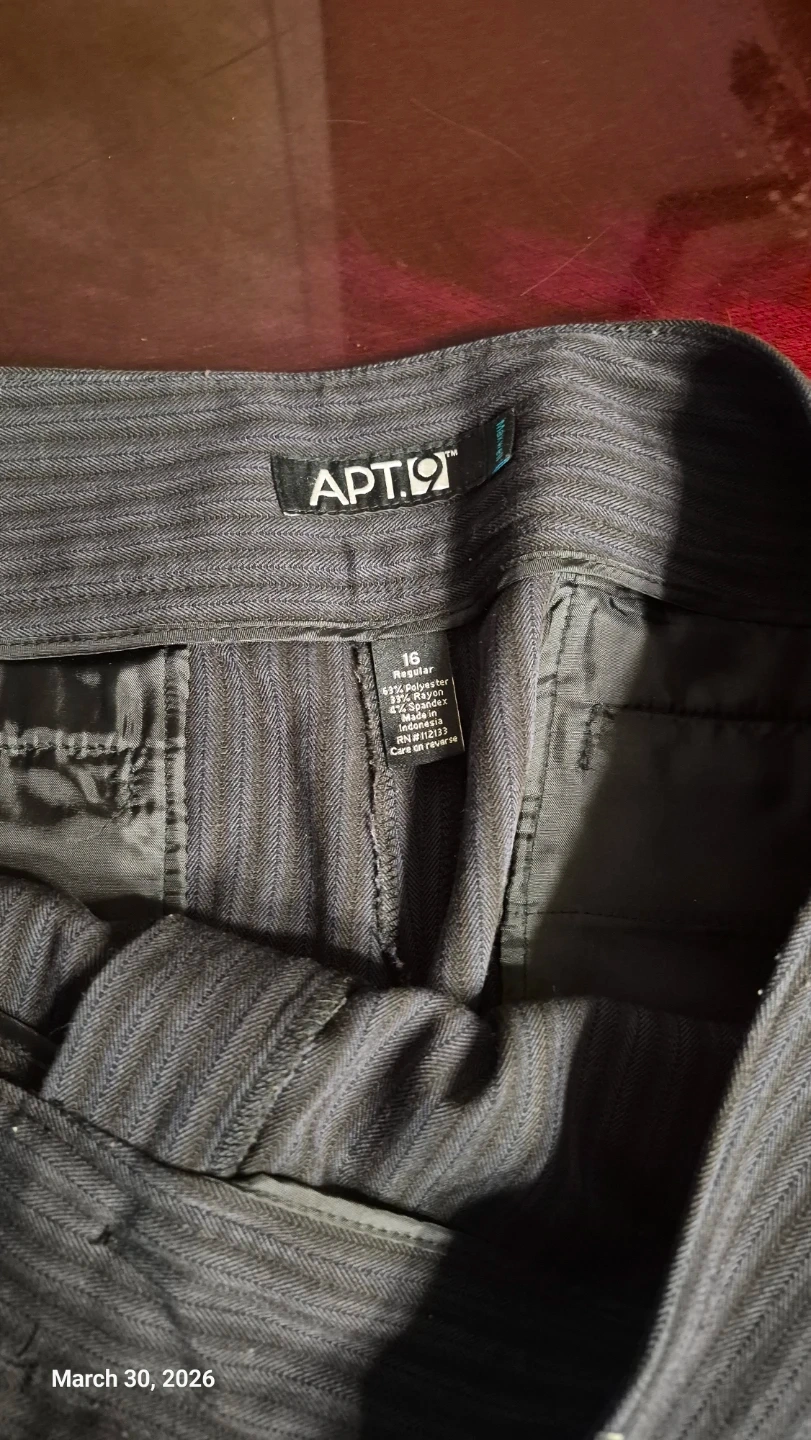 Women's dress pants from APT. 9. Features a pinstripe pattern and double-button waist. Made from a polyester and rayon blend. Size is 16 Regular.