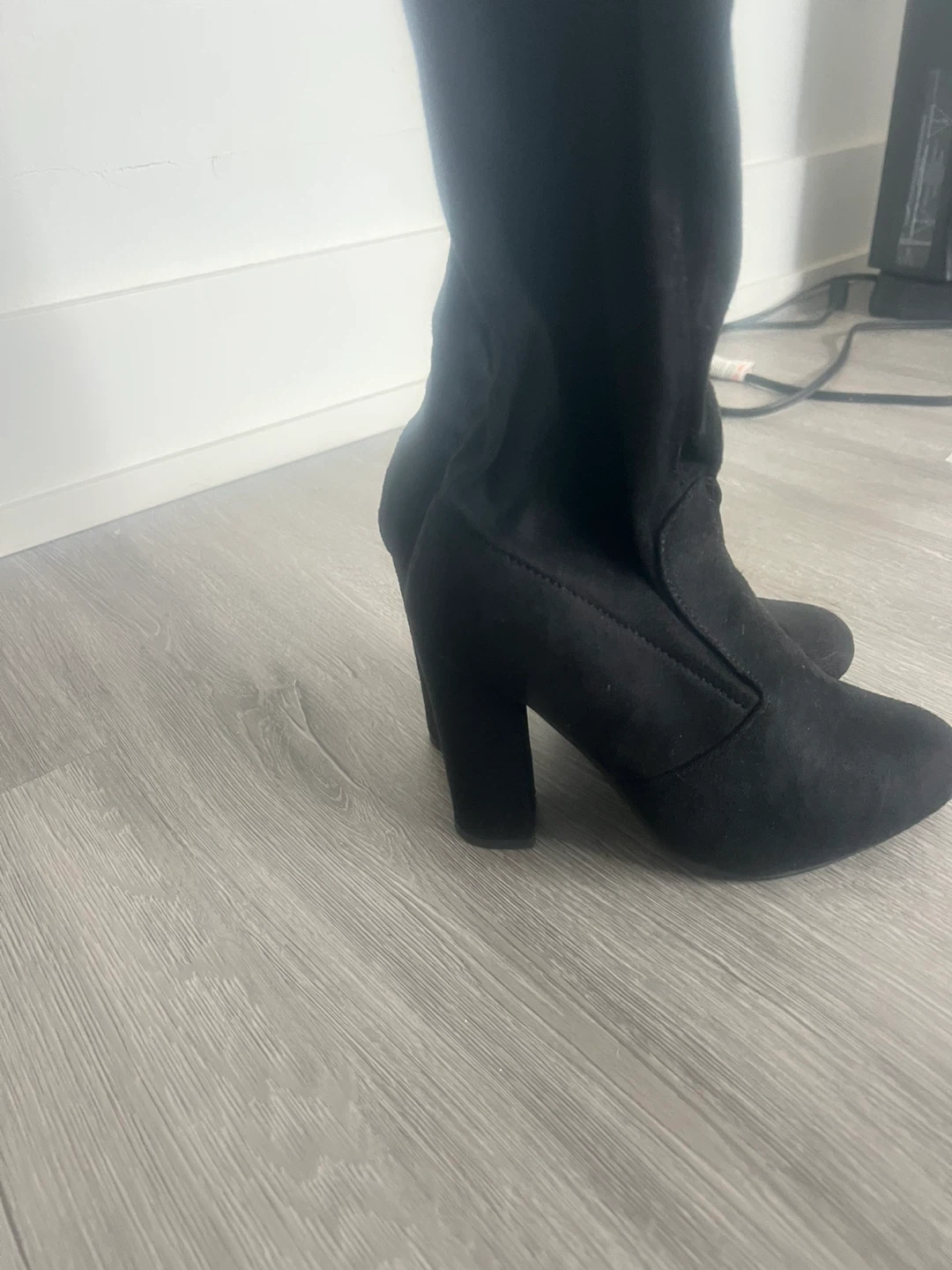 These black over-the-knee boots feature a comfortable block heel and a side zipper for easy on and off. They're made from a soft, stretchy material that hugs the leg. Perfect for elevating any outfit!