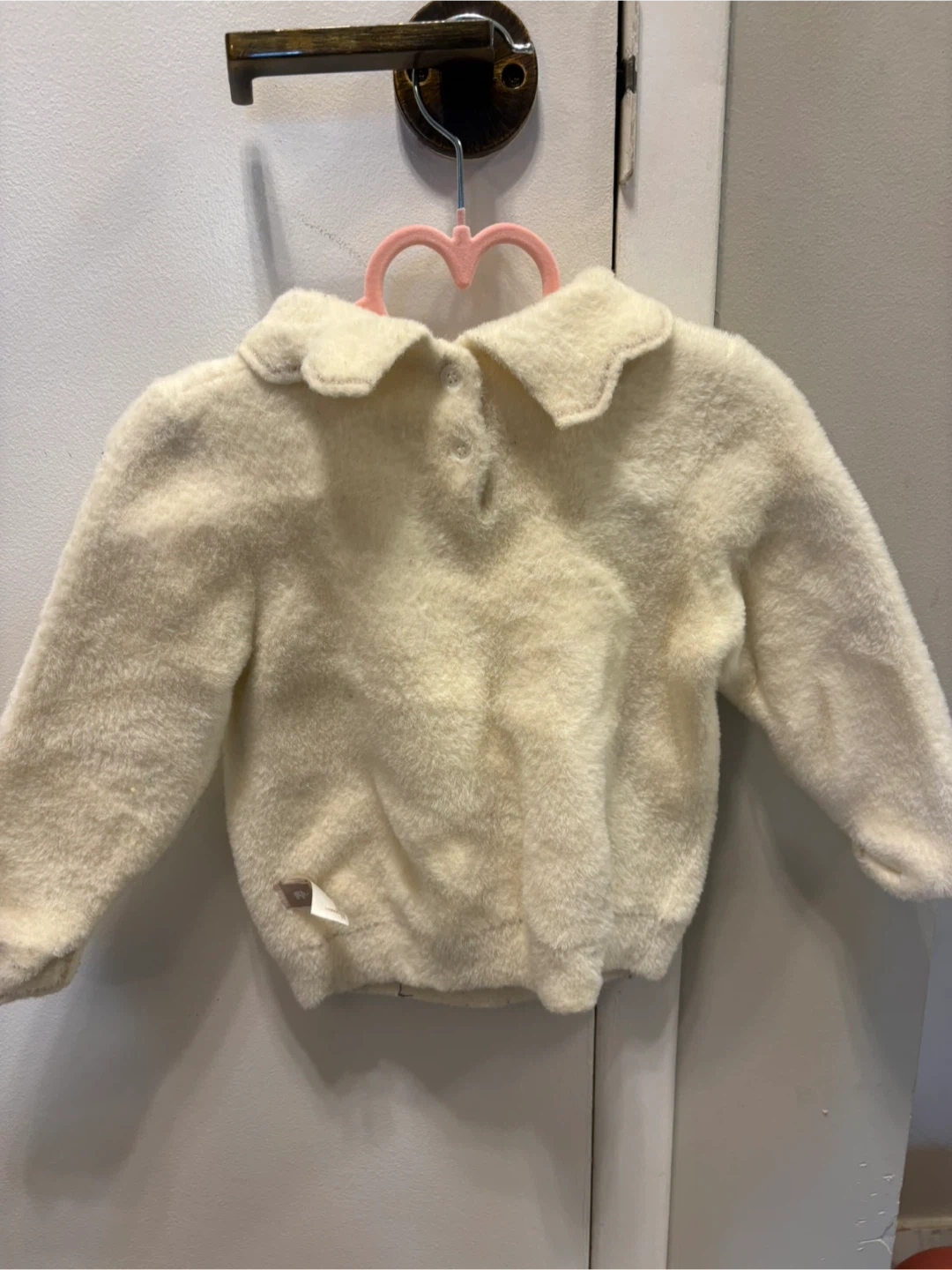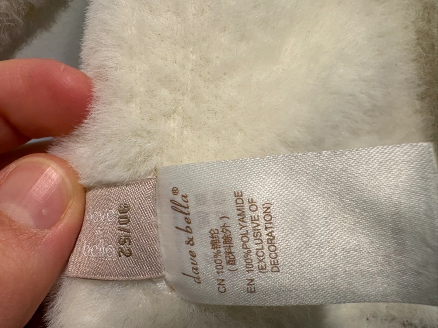 This cream fuzzy sweater is from Dave & Bella. It's made of 100% polyamide and features a cute black bow detail on the front. Perfect for keeping little ones warm and stylish!