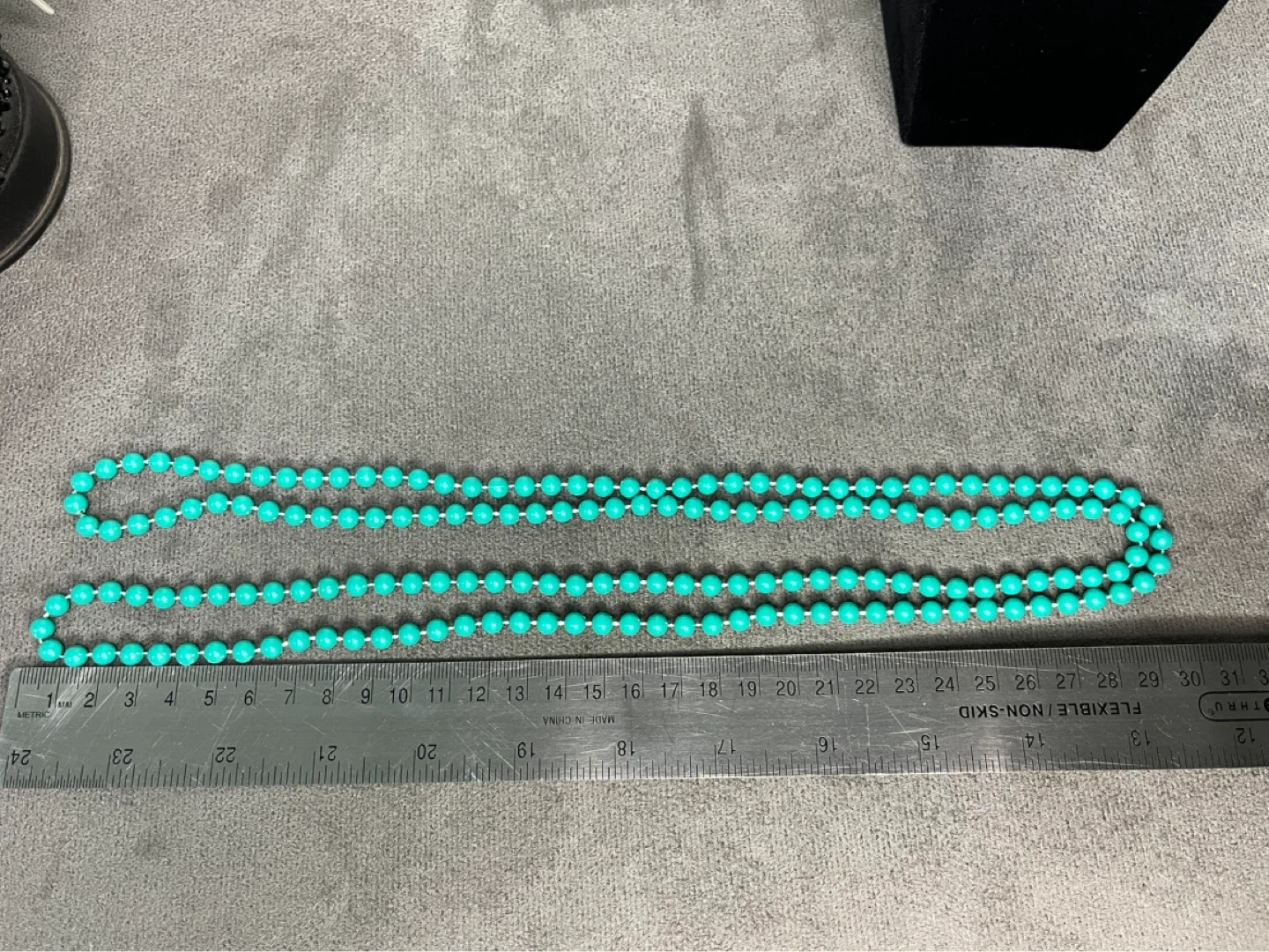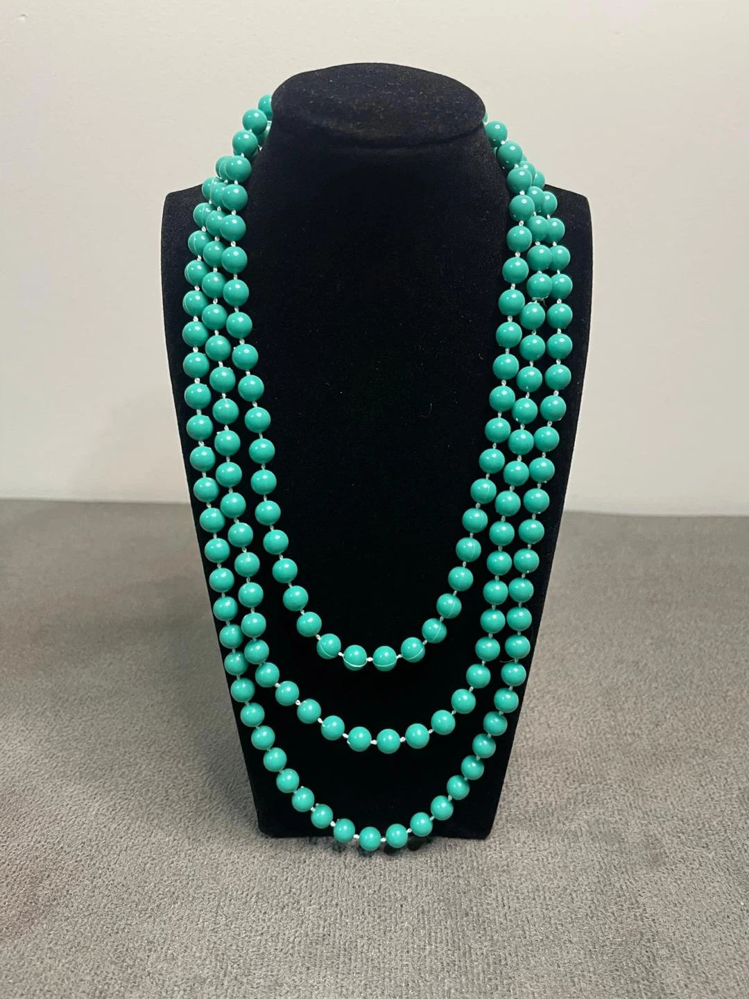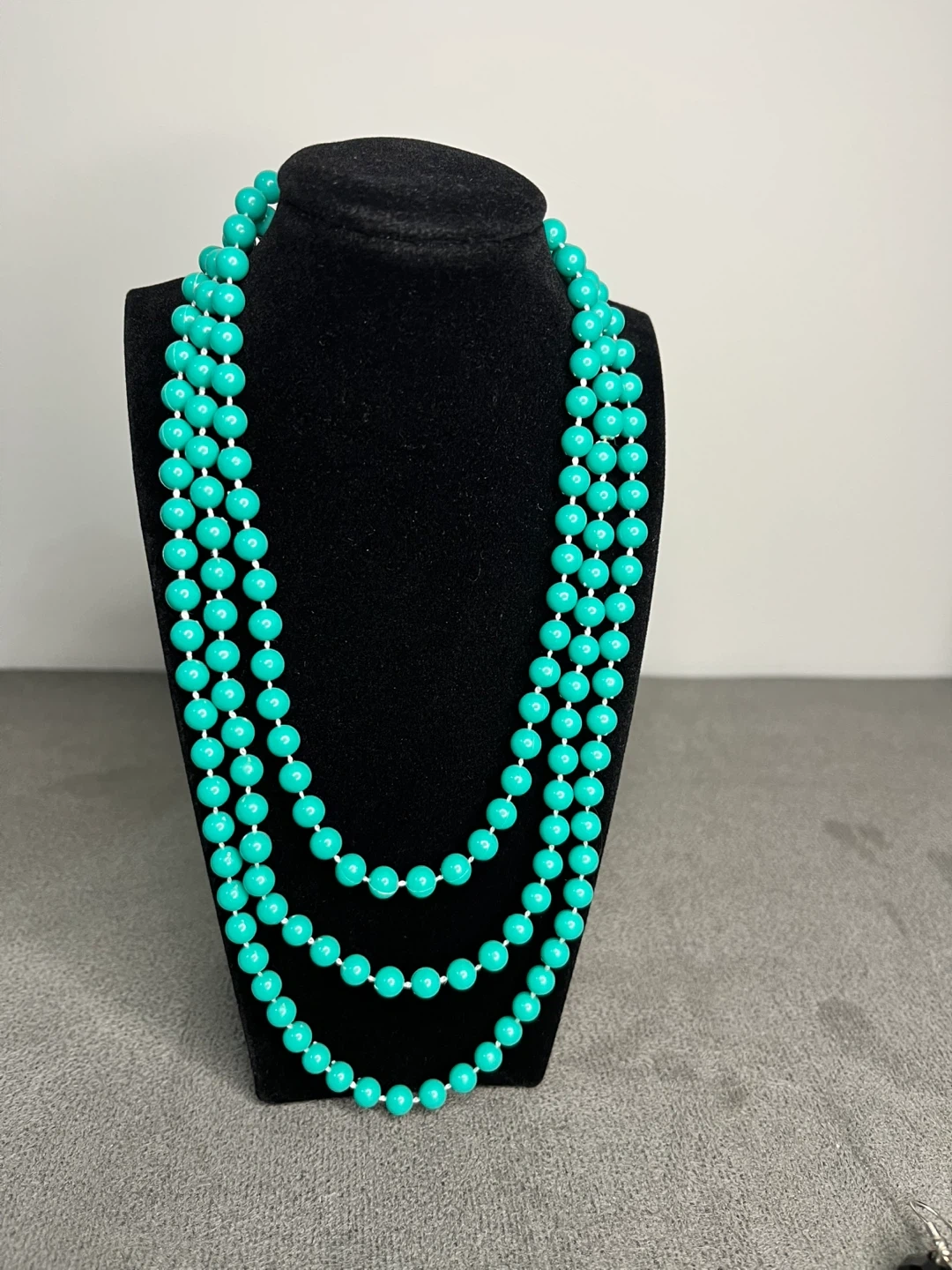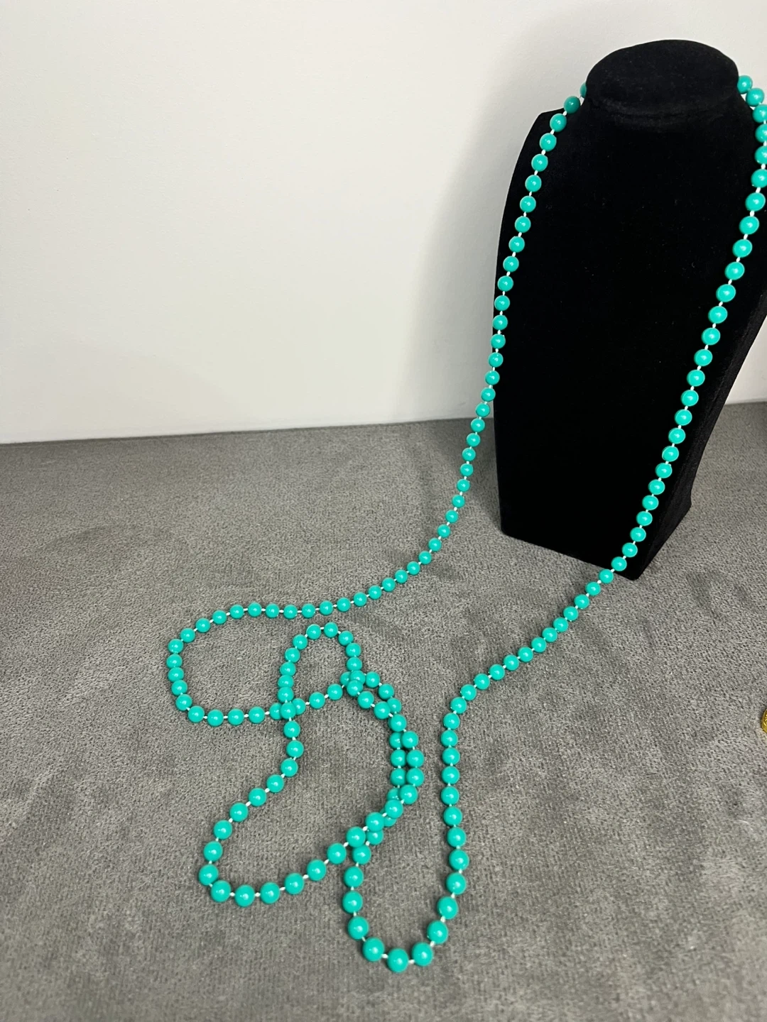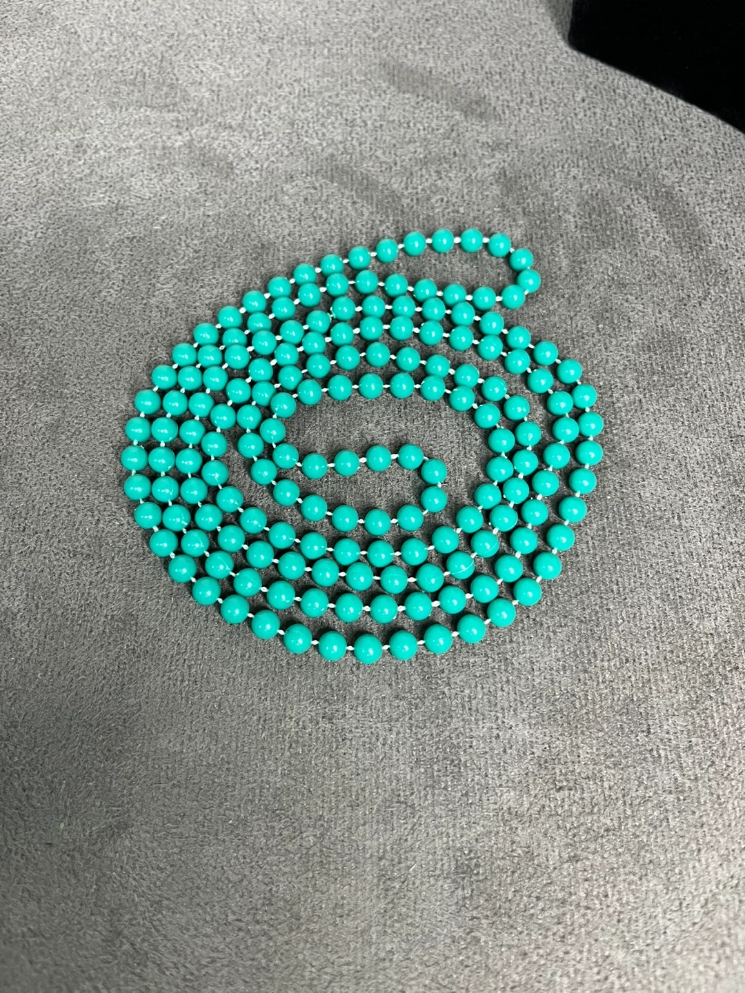 This is a long, multi-strand turquoise beaded necklace. It's approximately 60 inches long when laid flat. Beads are a bright, opaque turquoise with small silver accents.