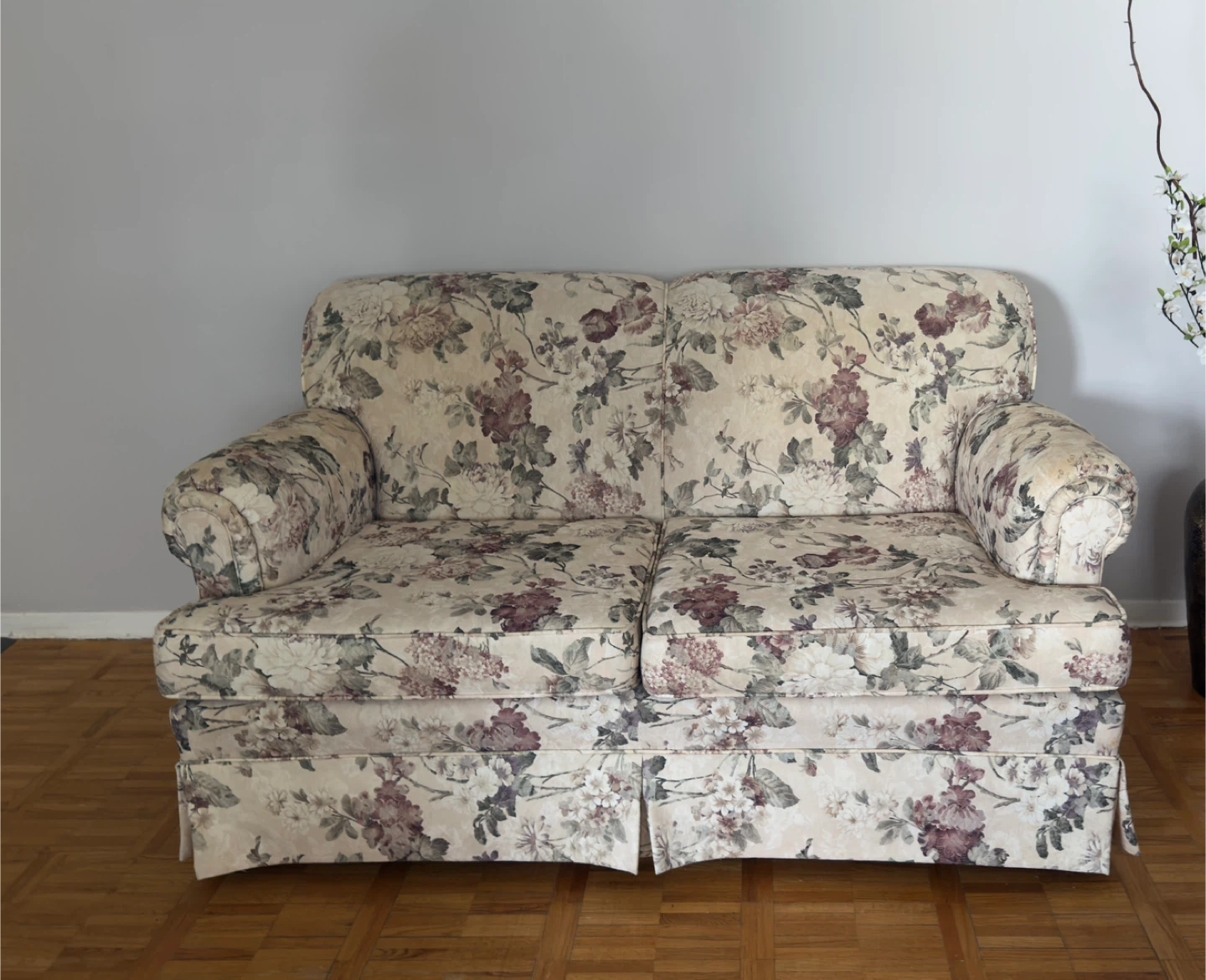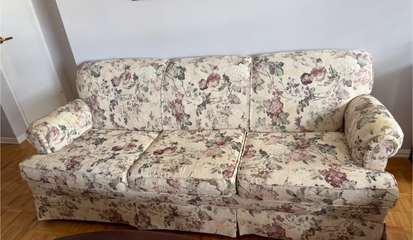 This is a comfortable three-seater sofa and love seat with a lovely floral print fabric. It features plush cushions and rolled arms. Skirted base for a clean look.